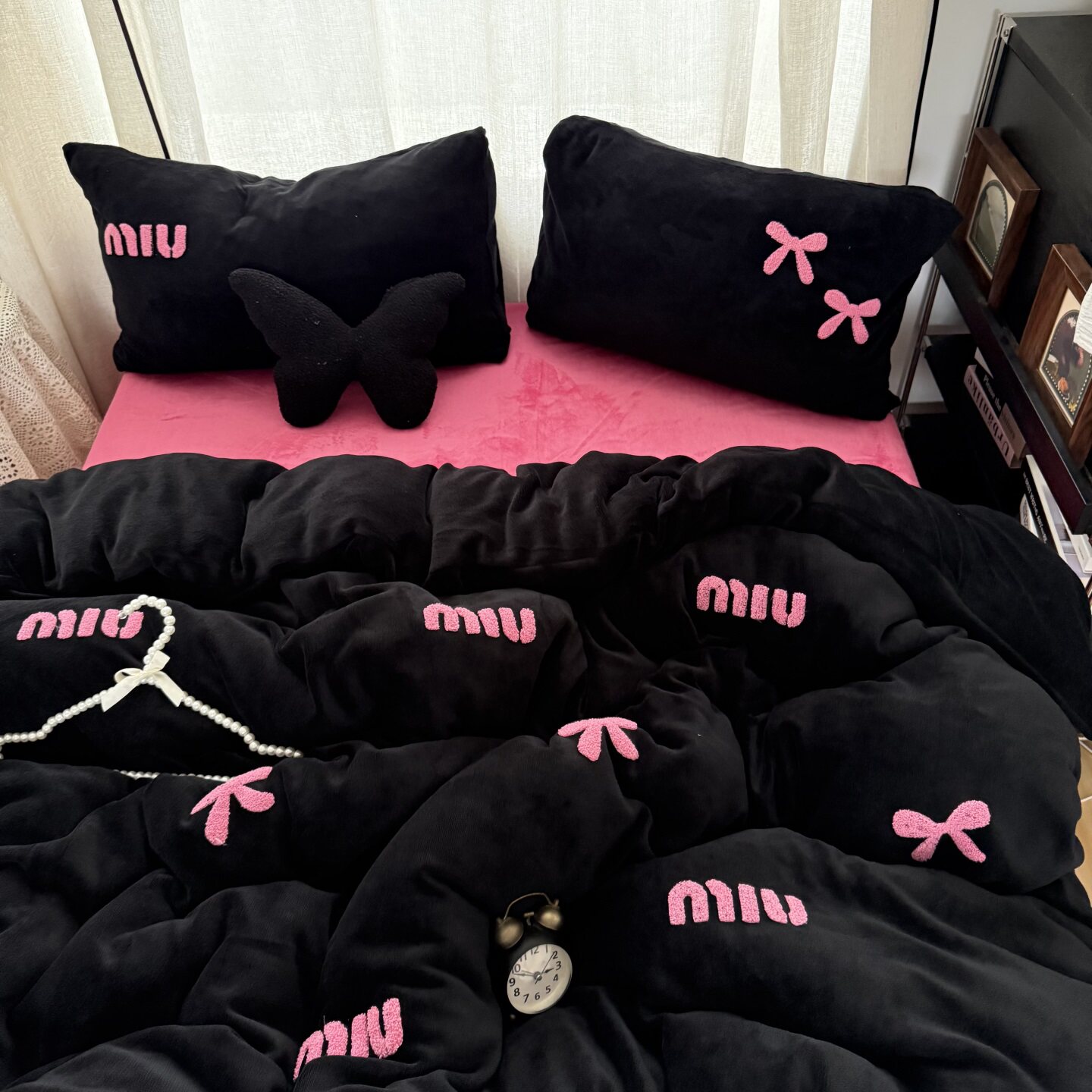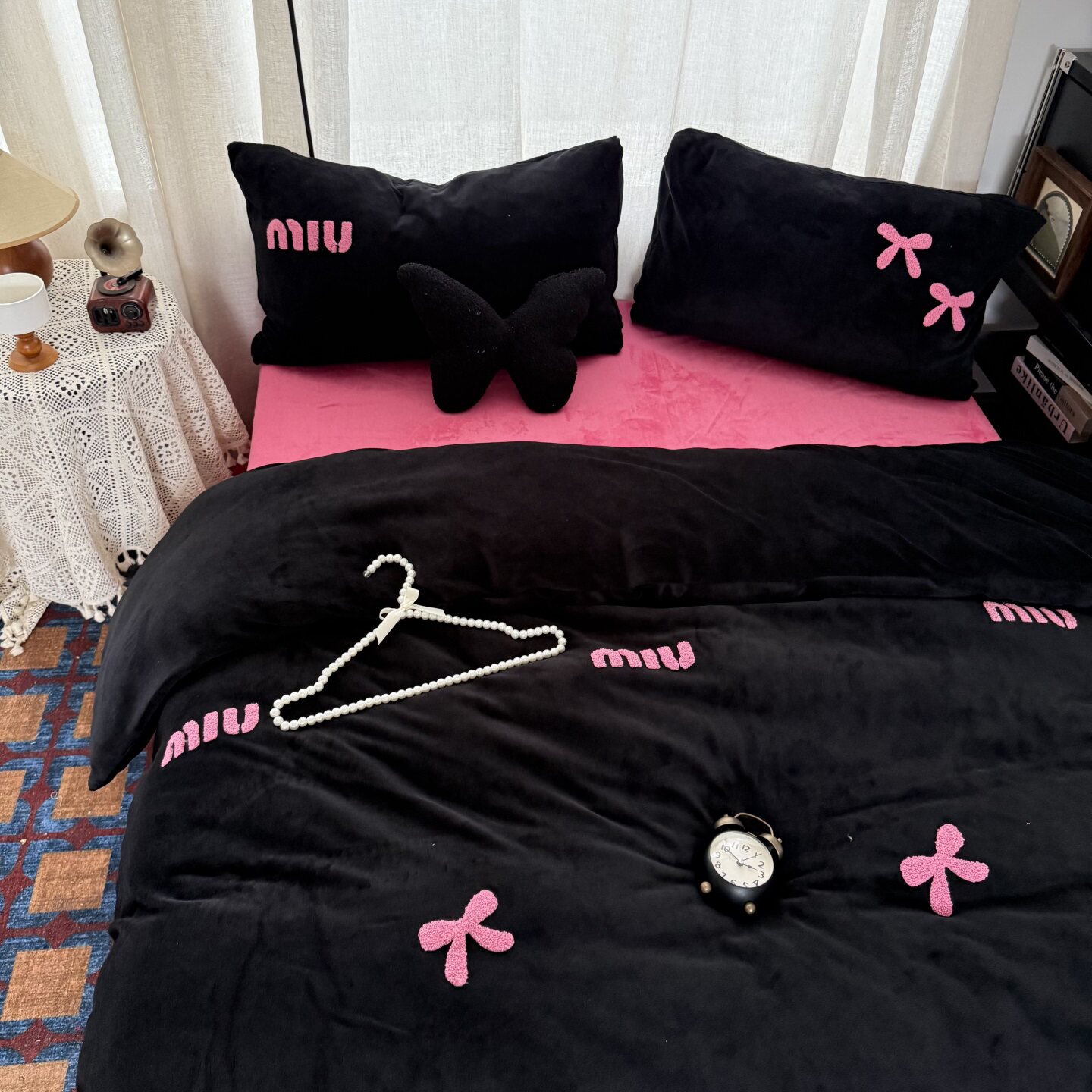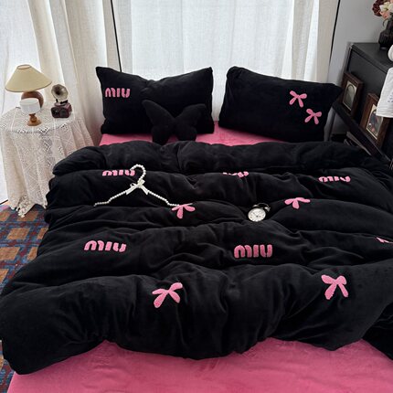 多巴胺少女黑玫粉蝴蝶结毛巾绣加厚牛奶绒四件套冬天珊瑚绒三件套
