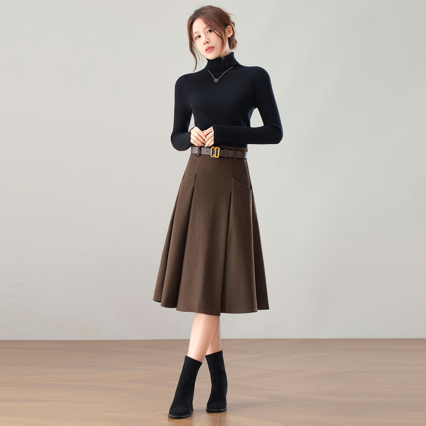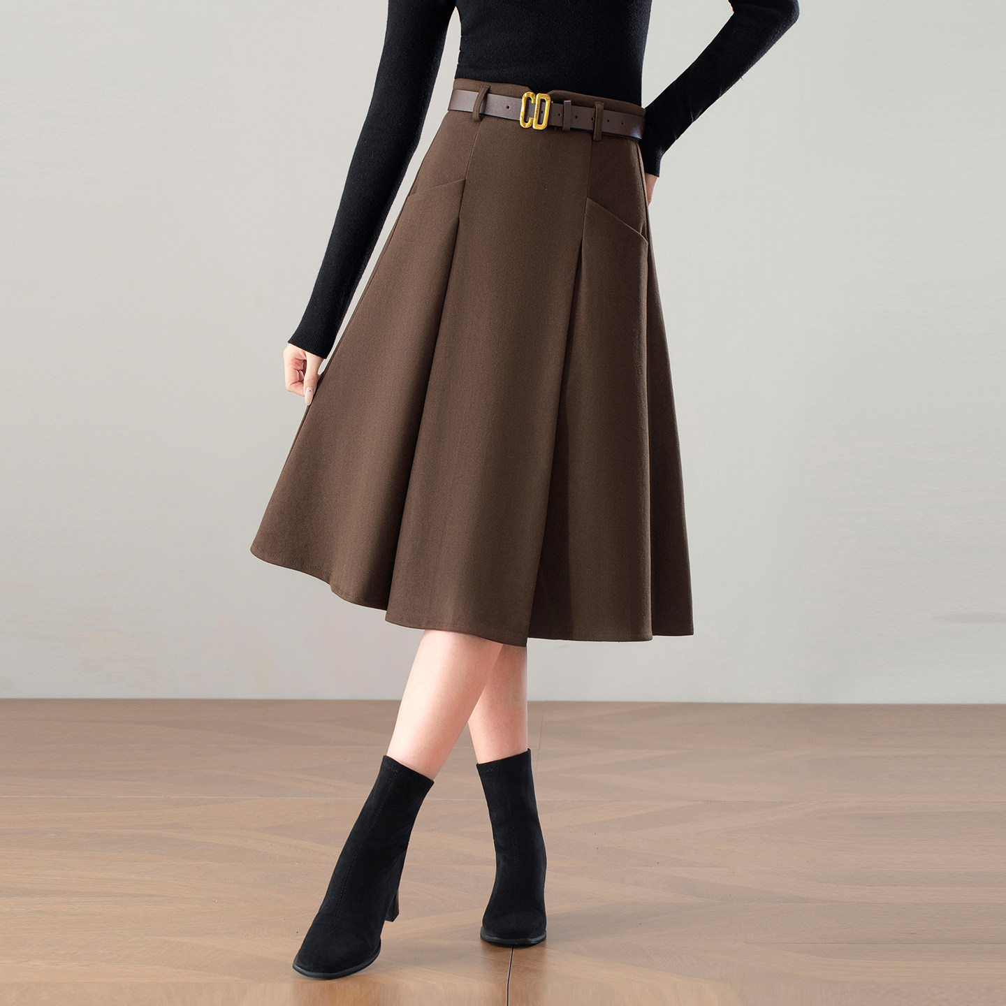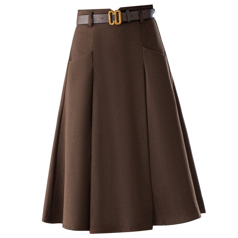 轻熟简约呢子A字半身裙厚女冬季2025新款口袋高腰中长款大摆伞裙