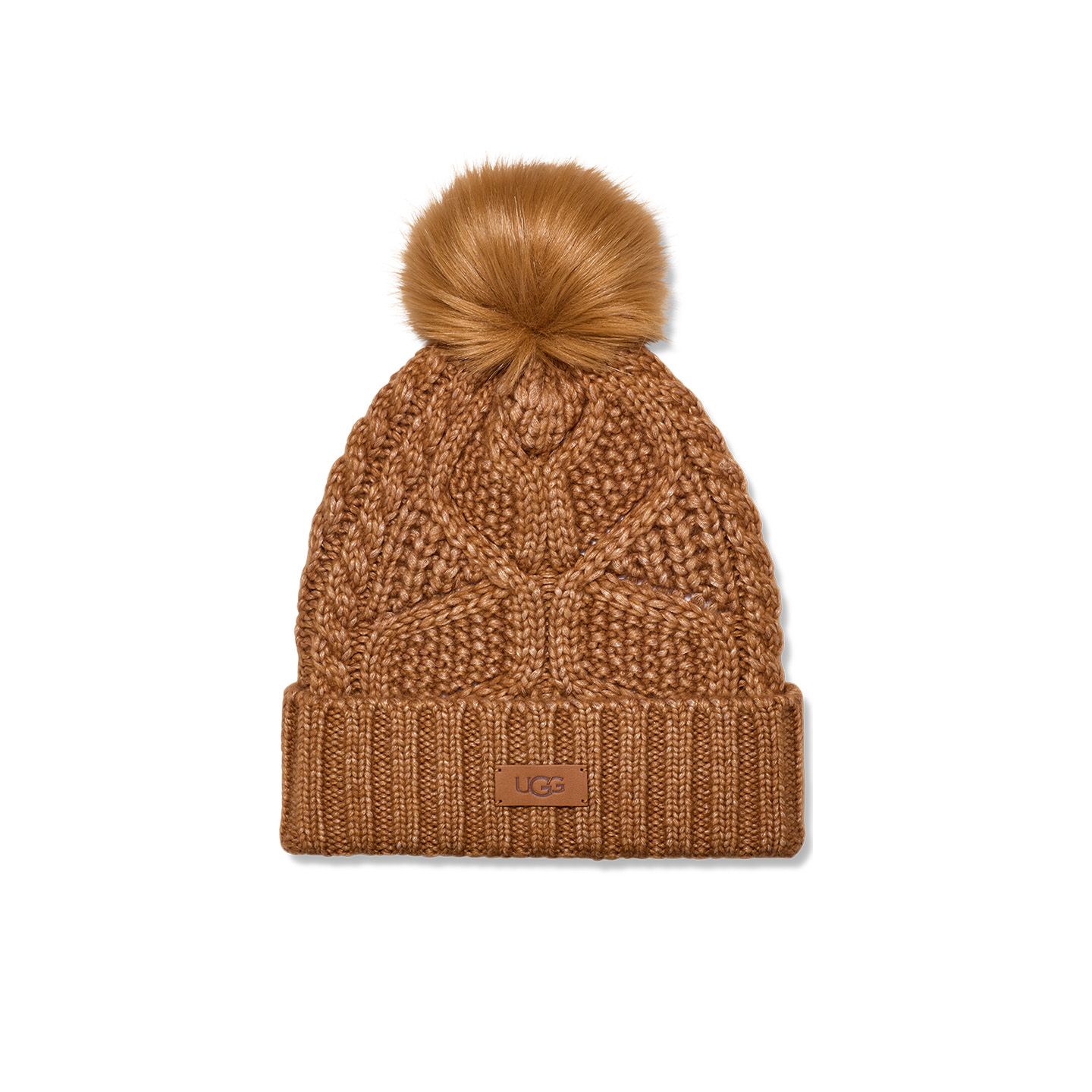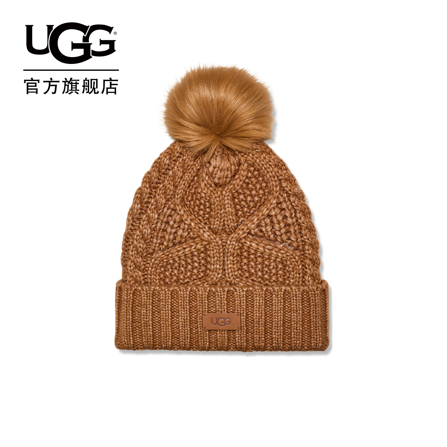 UGG秋季新款女士时尚舒适保暖带毛球款麻花纹毛线帽针织帽 100819