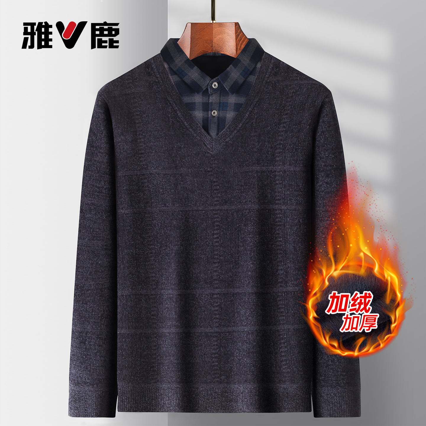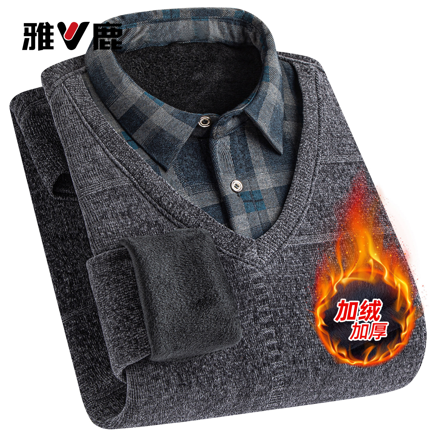 雅鹿男士雪尼尔加绒针织衫2025冬季新款衬衫领假两件保暖毛衣JM