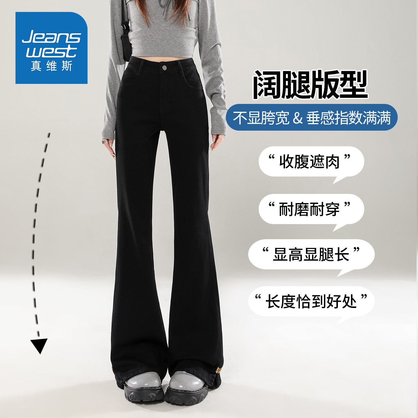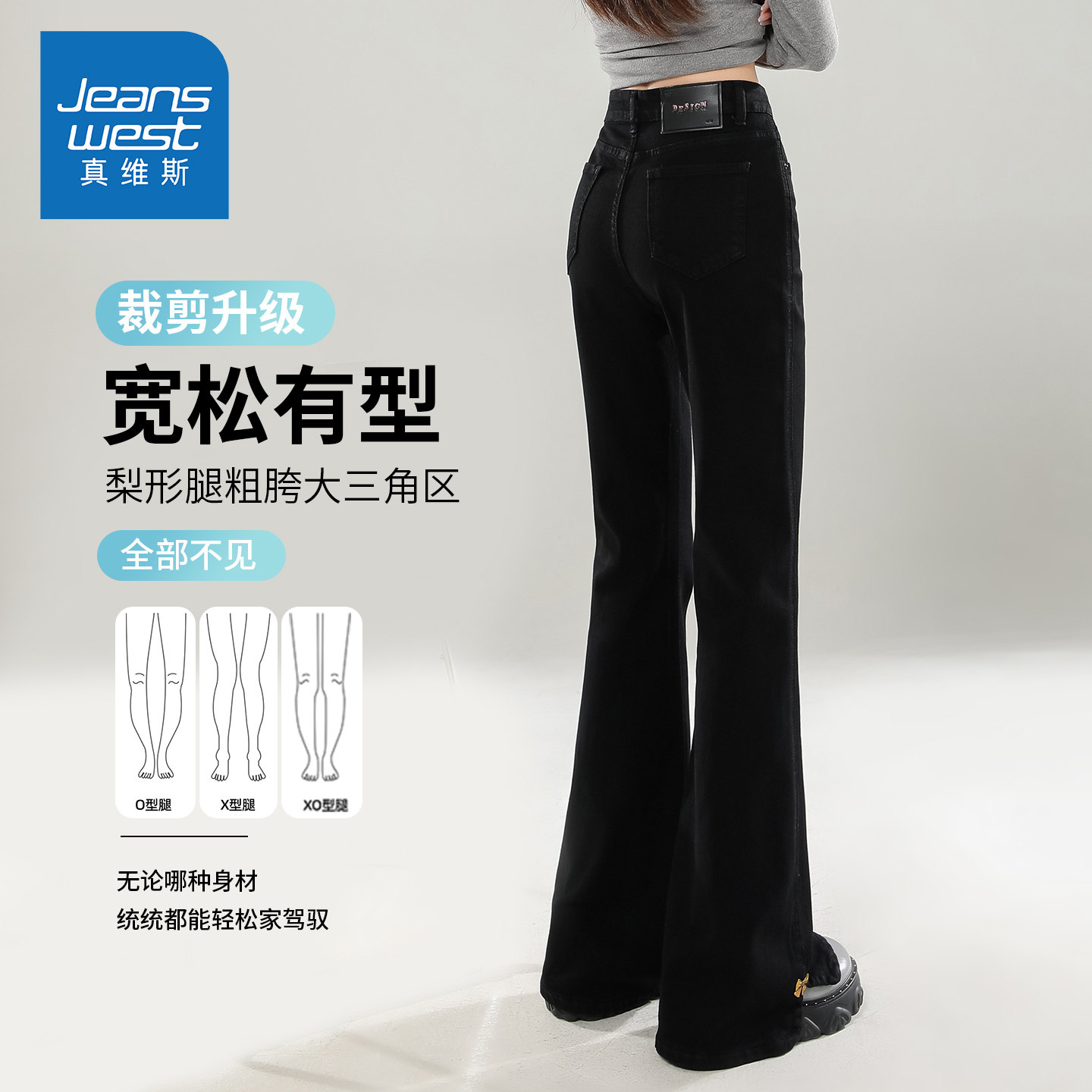 KZH真维斯加绒黑色牛仔裤女秋冬新款修身微喇裤加厚高腰开叉长裤