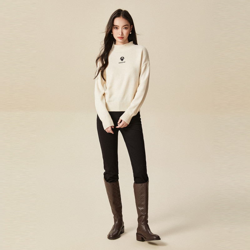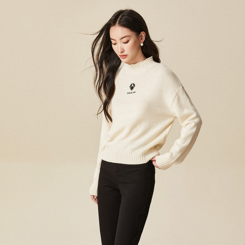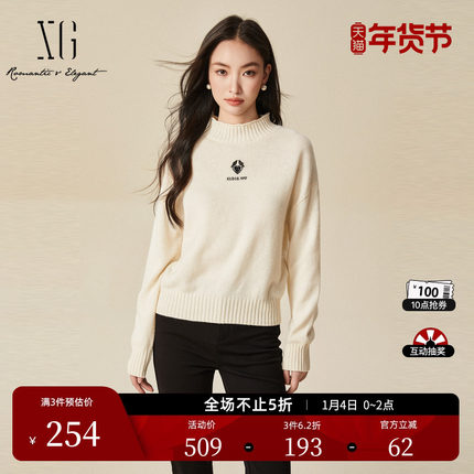 XG雪歌白色厚款长袖毛针织衫时尚冬季新款通勤绵羊毛套头毛衫女装
