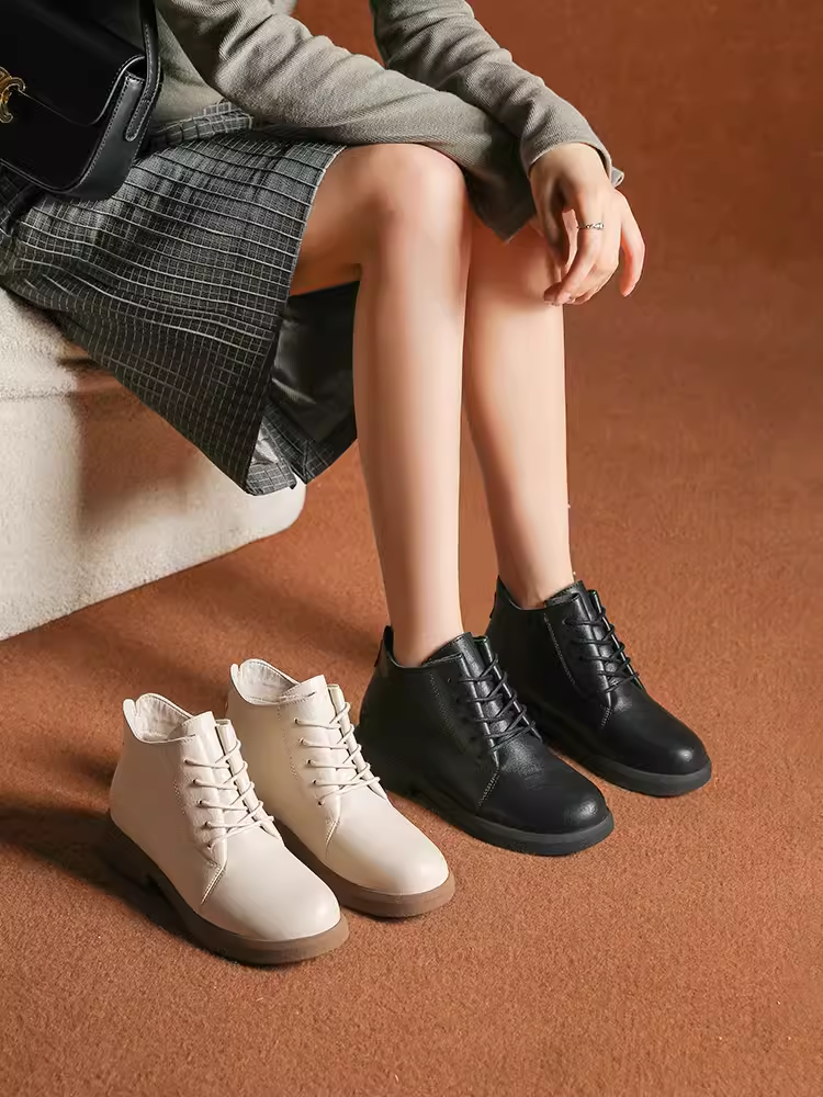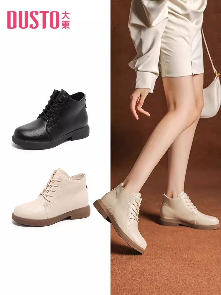 大东马丁靴023冬季新款简约风中跟粗跟短靴圆头系带女鞋23D1251