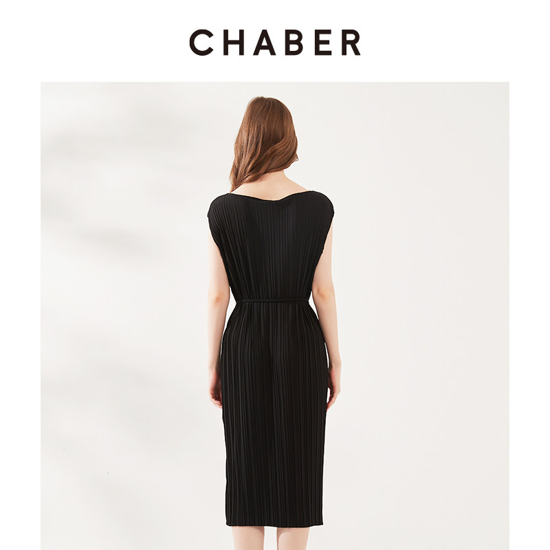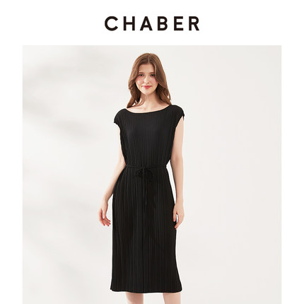 chaber巧帛夏季新款复古气质优雅百搭显瘦收腰褶皱连肩中长连衣裙