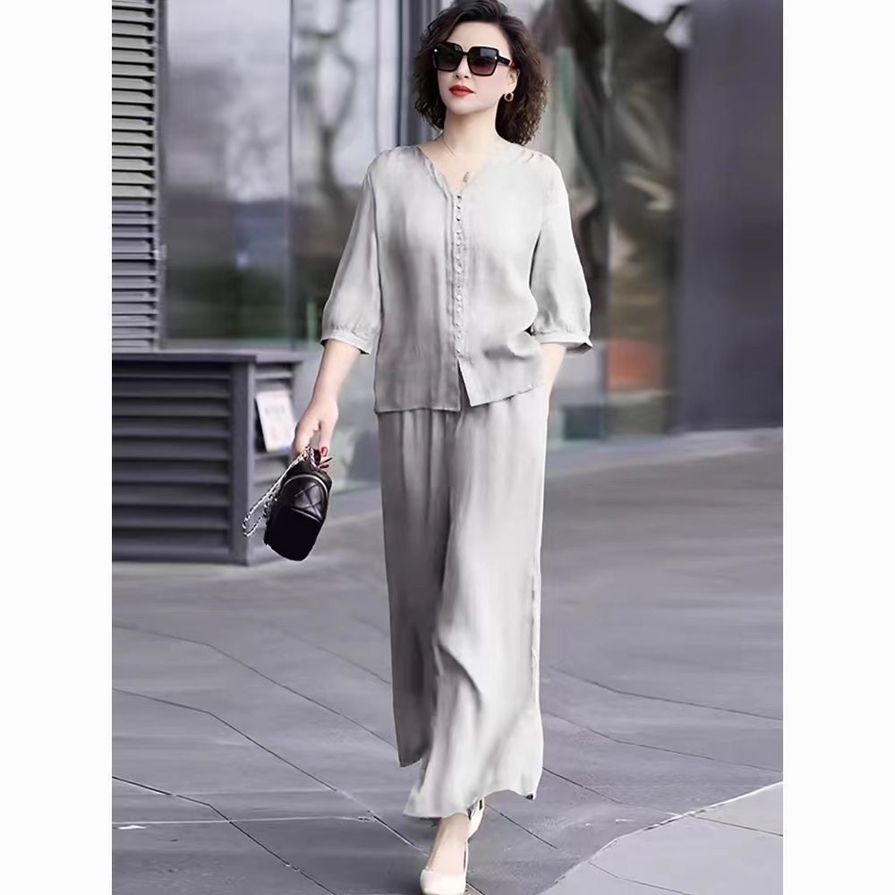 贵夫人妈妈夏装棉麻亚麻套装女高端洋气时尚宽松显瘦阔腿裤两件套