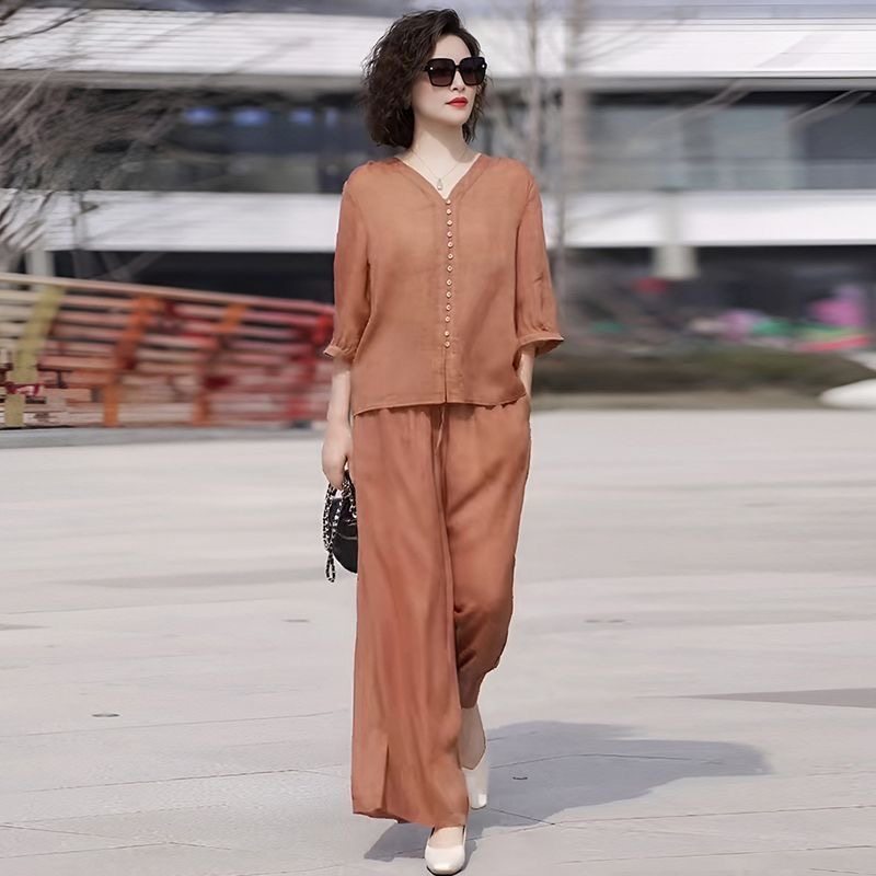 贵夫人妈妈夏装棉麻亚麻两件套女