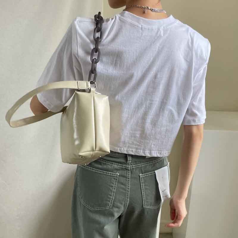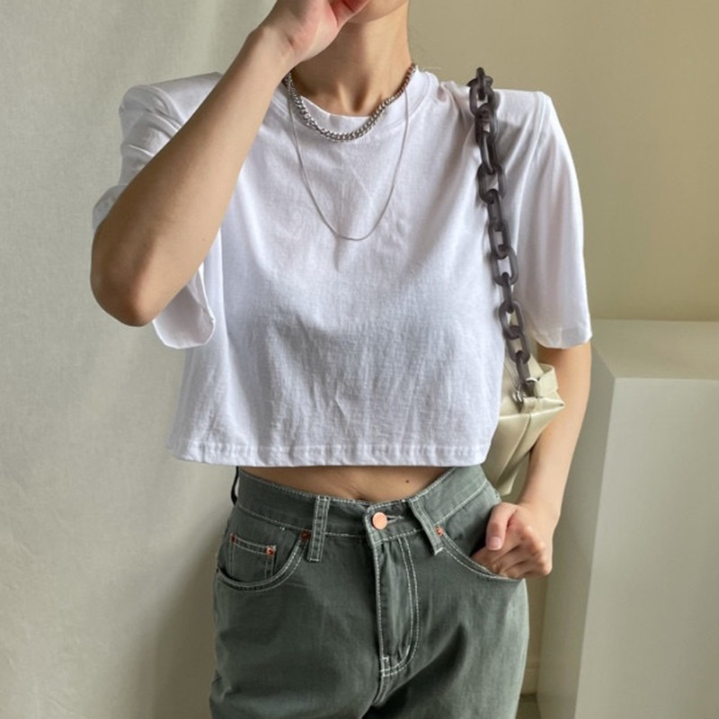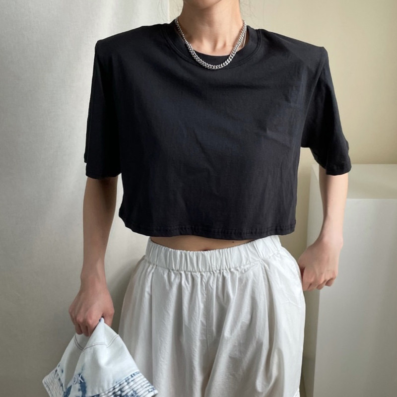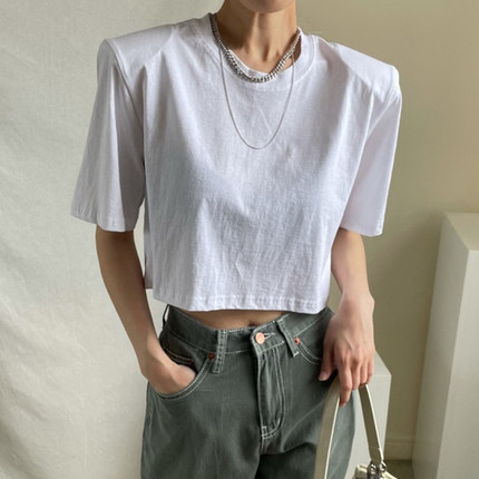 韩国chic夏季小众基础款圆领宽松纯色百搭套头垫肩短袖T恤上衣女