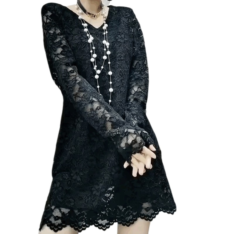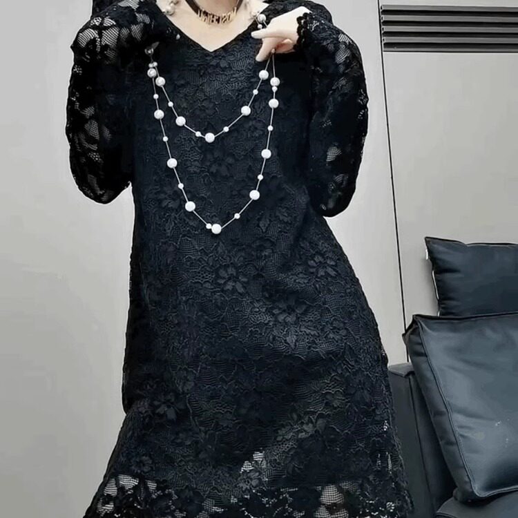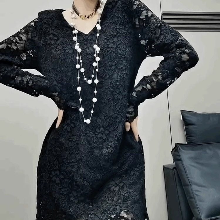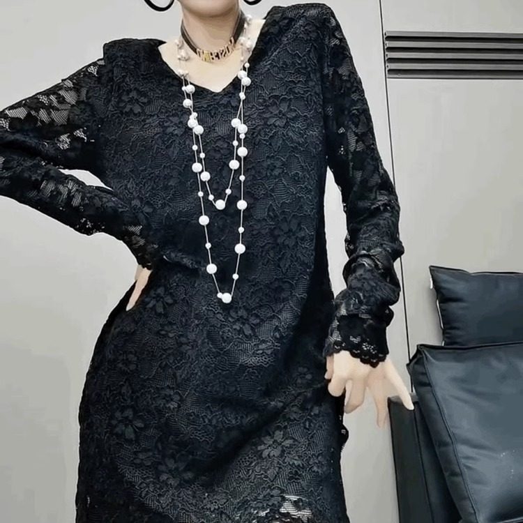 中长款蕾丝植绒V领连衣裙女名媛风镂空修身黑色打底裙小个子裙子