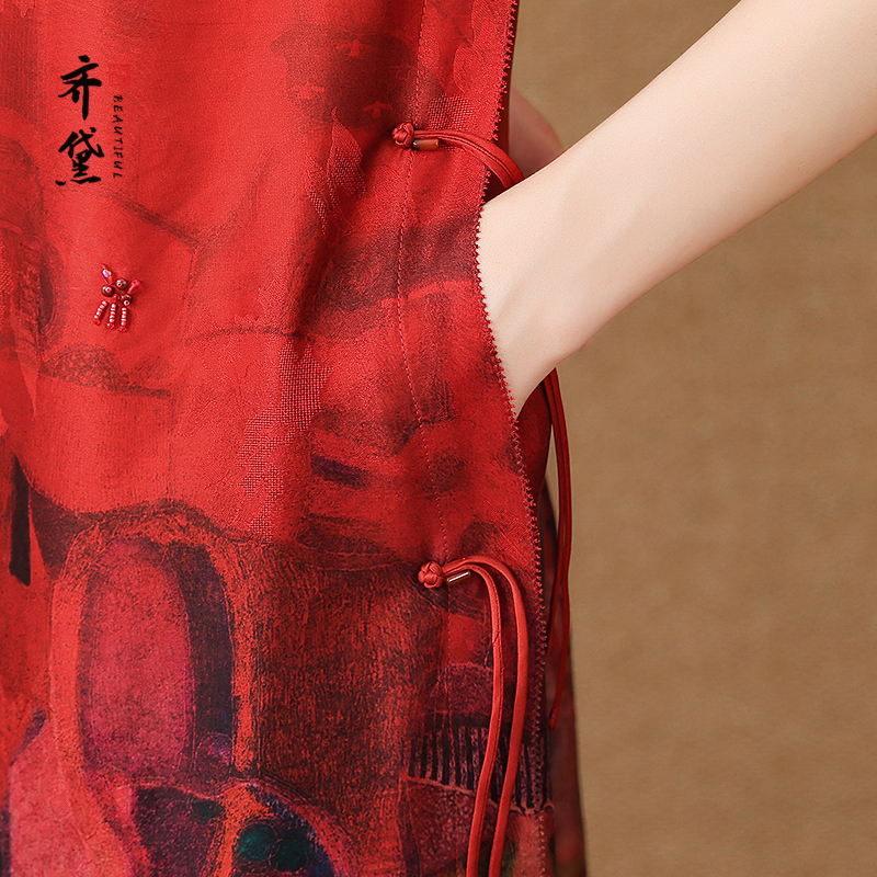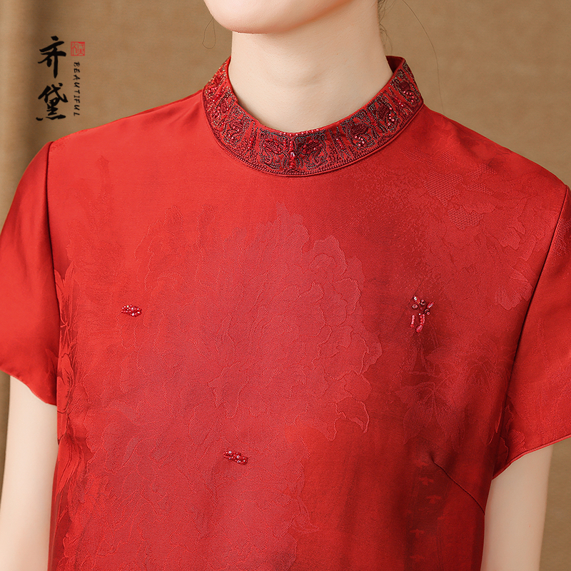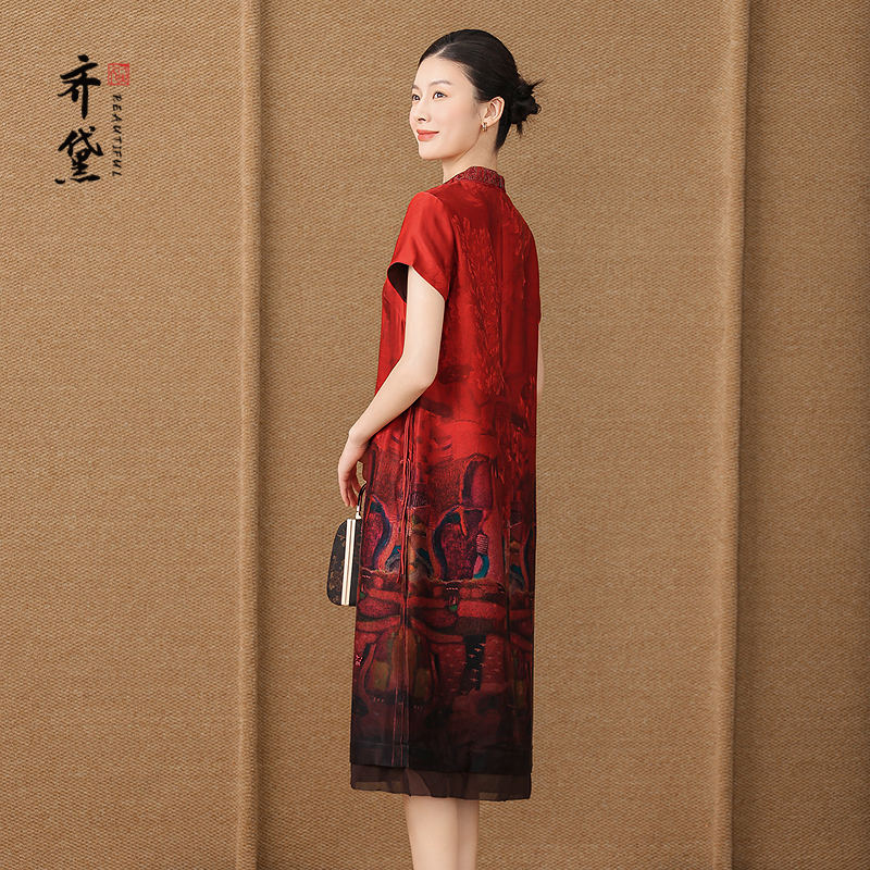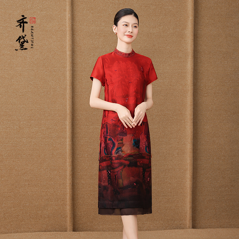 齐黛红色花罗香云纱连衣裙女2025新款喜婆婆婚宴礼服妈妈真丝裙子