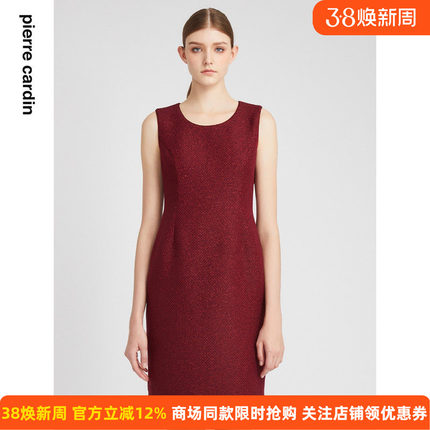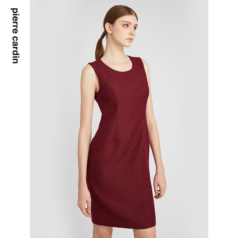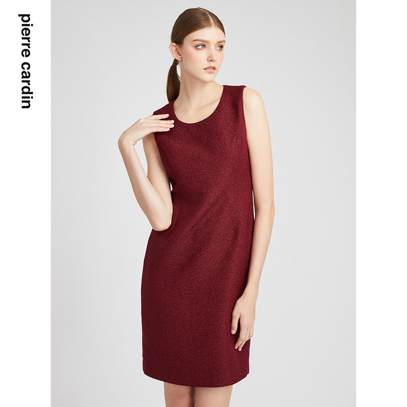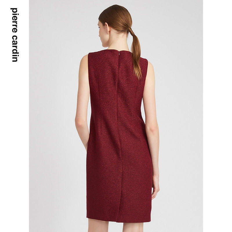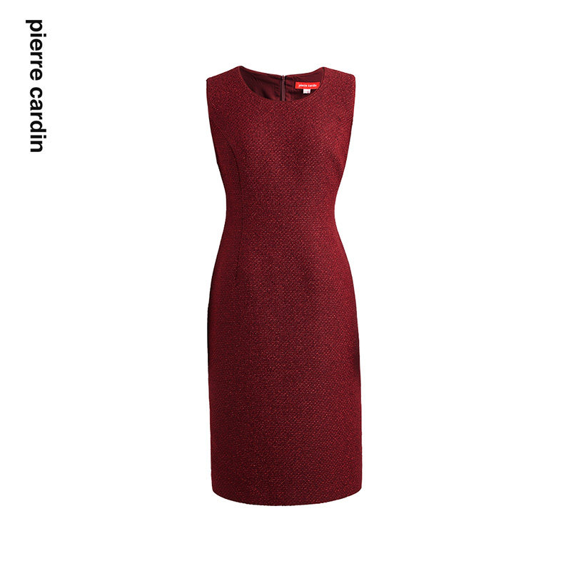 商场同款皮尔卡丹女装连衣裙无袖圆领酒红亮丝通勤裙子