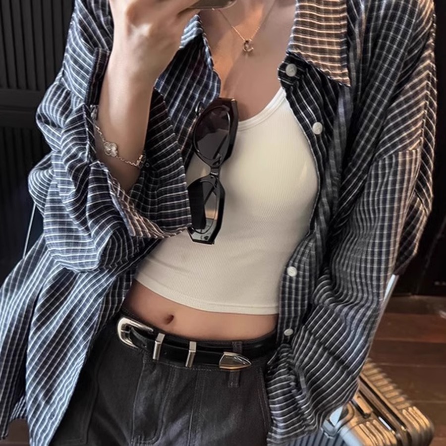 蓝调时刻复古格子防晒衬衫外套女韩系早秋宽松慵懒风衬衣长袖上衣