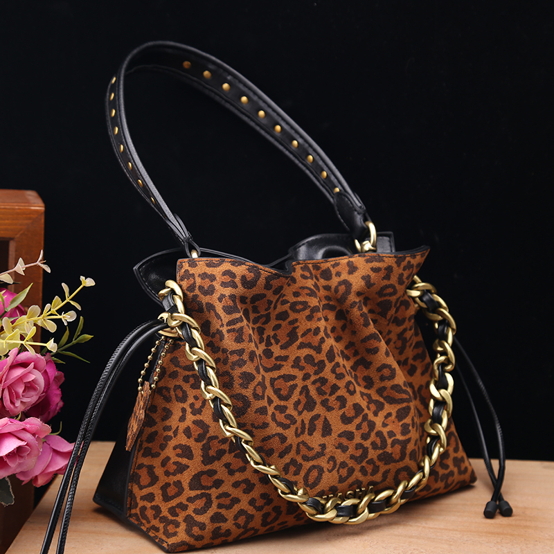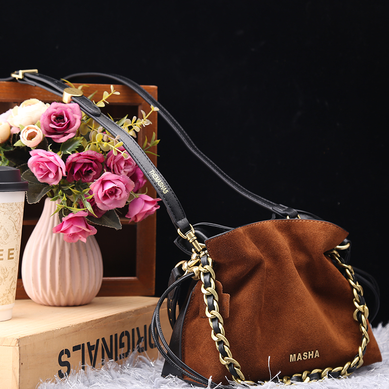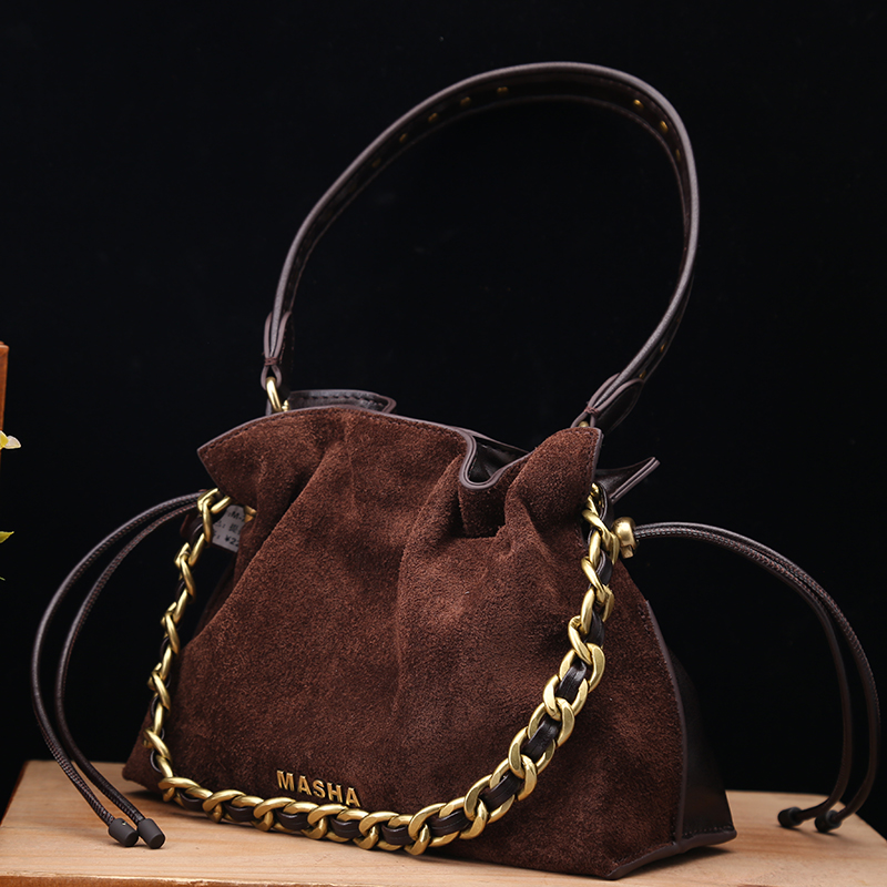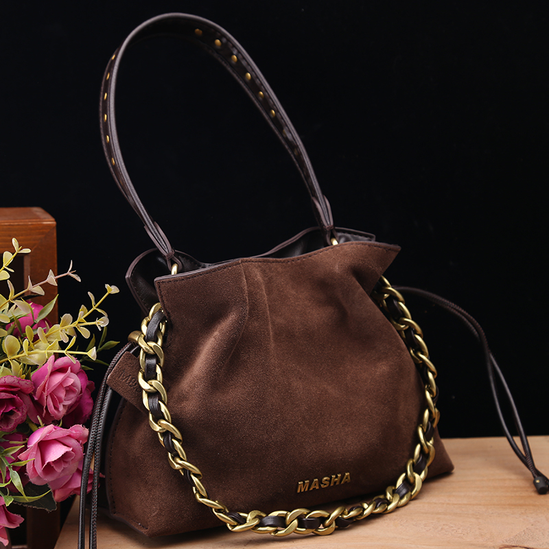 头层牛皮专柜正品真皮女包2025新款时尚复古磨砂牛皮手提水桶包潮
