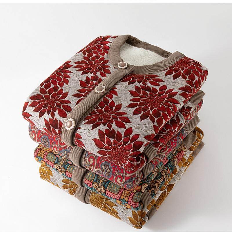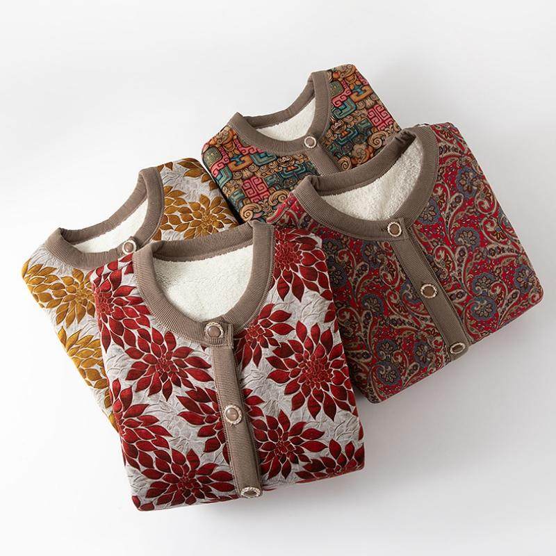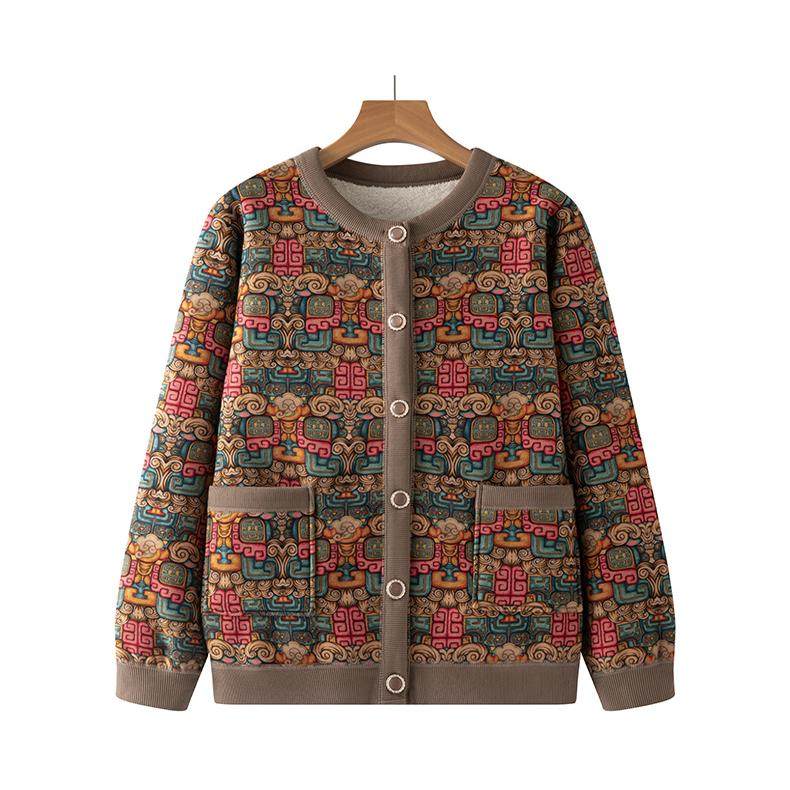 中老年人气质开衫印花秋冬款加绒加厚保暖休闲短外套女妈妈装上衣