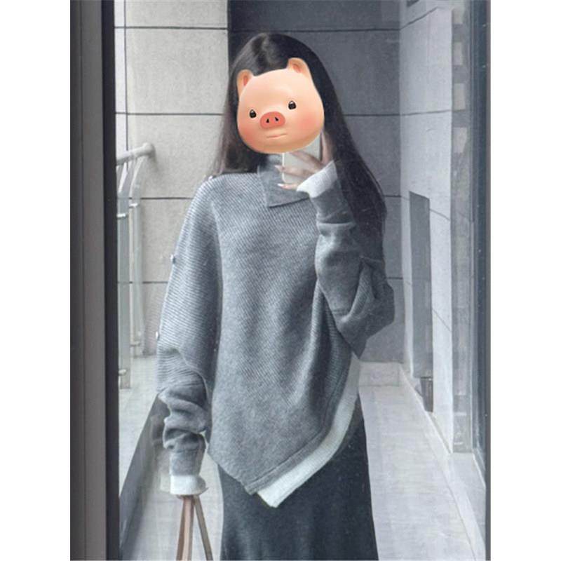 灰色不规则高领蝙蝠袖毛衣女秋冬高级感中长款宽松针织羊毛衫上衣