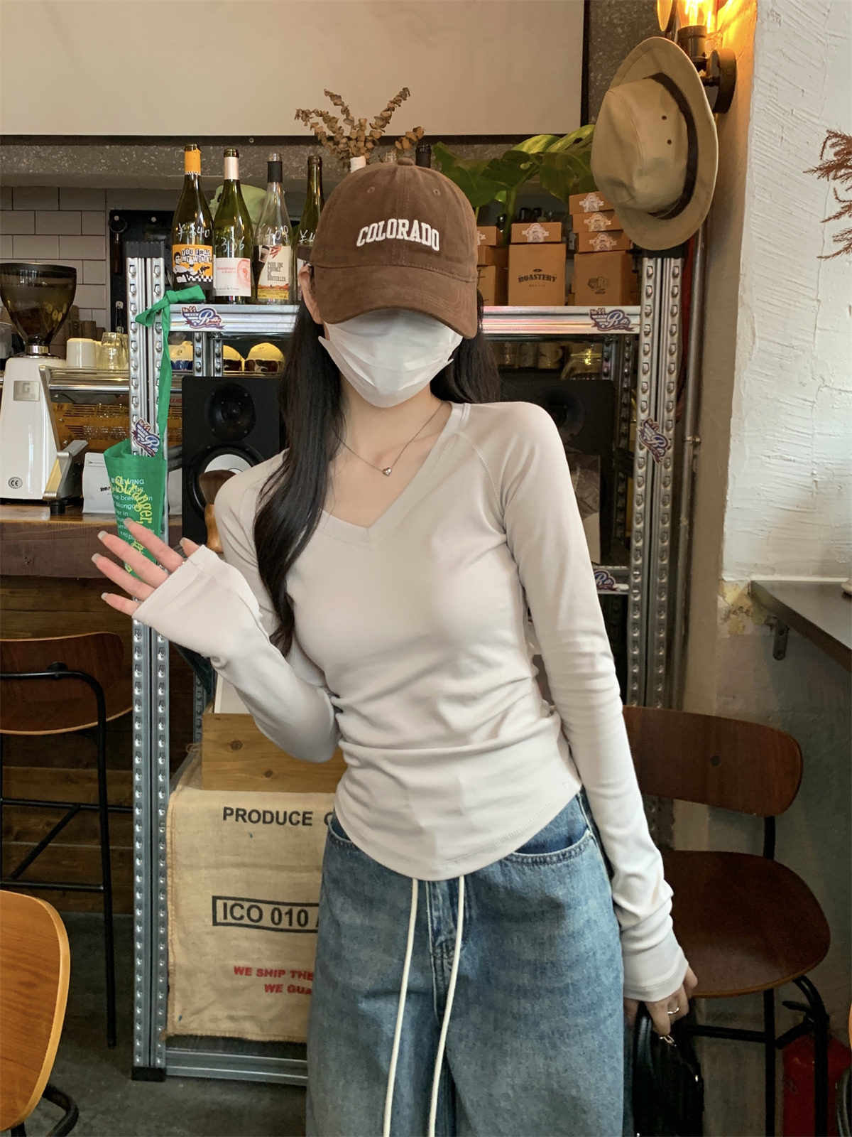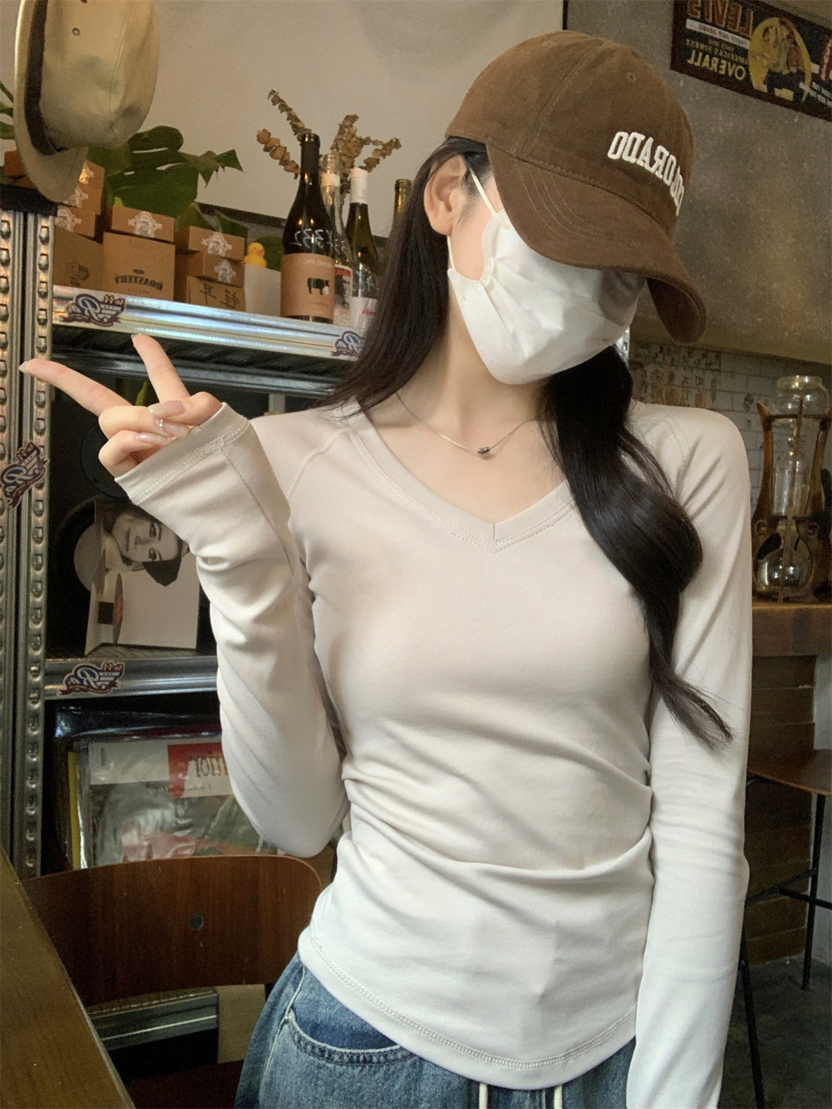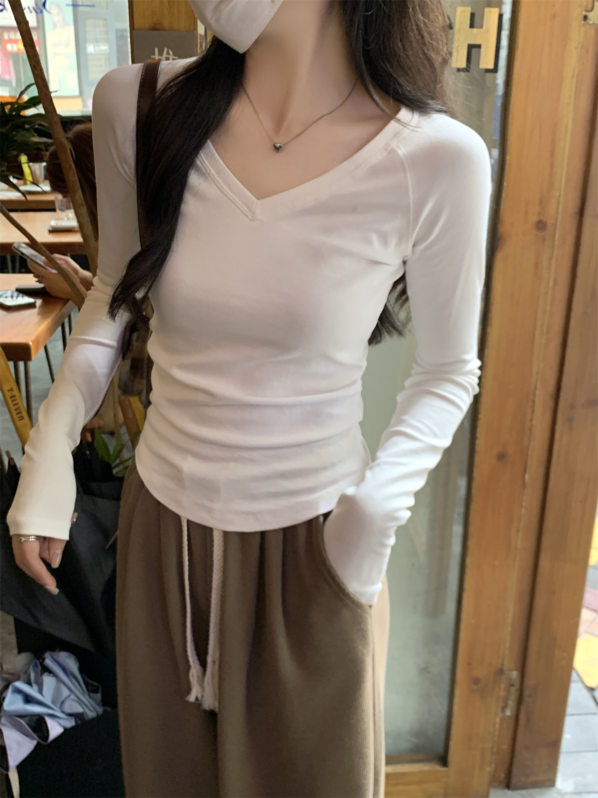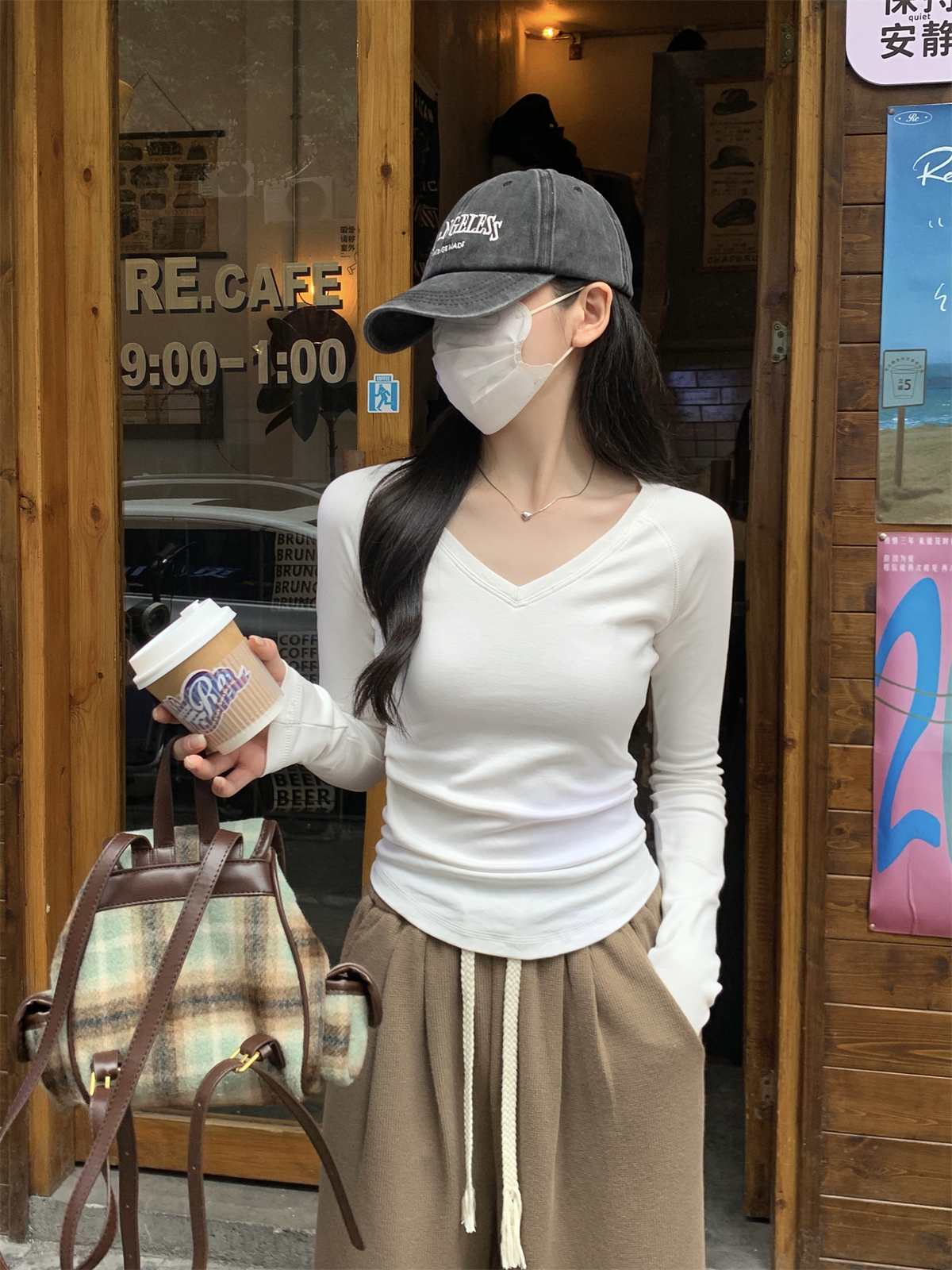 2025秋冬韩版修身v领插肩显瘦内搭设计感纯棉长袖T恤女纯色上衣潮