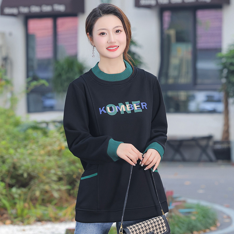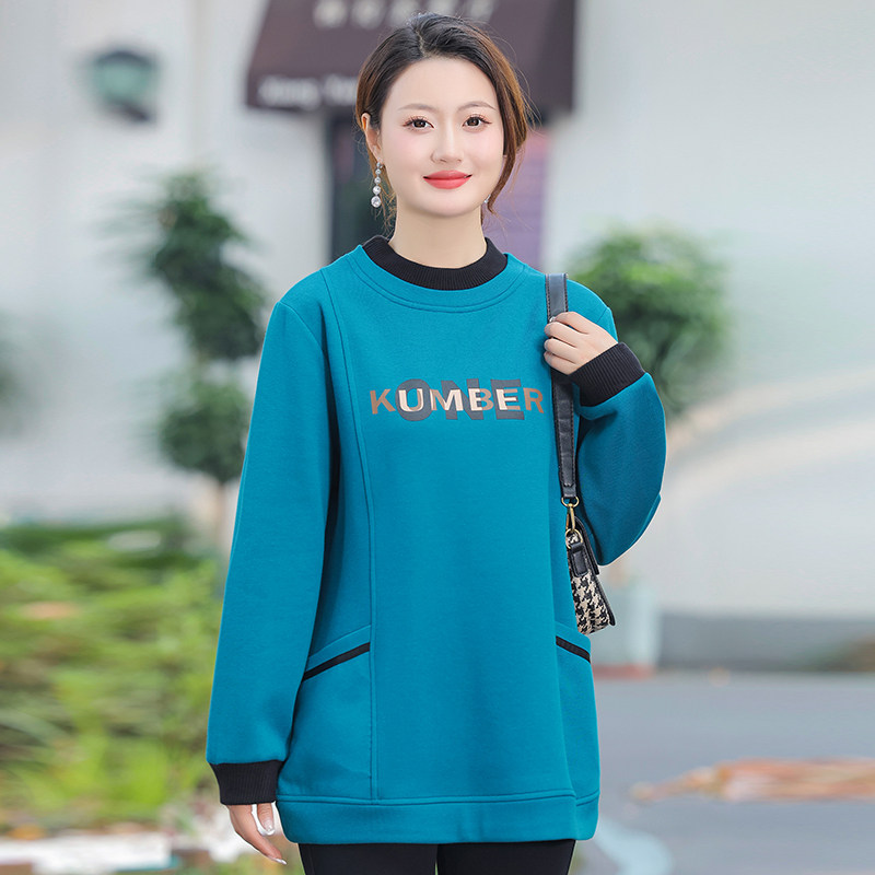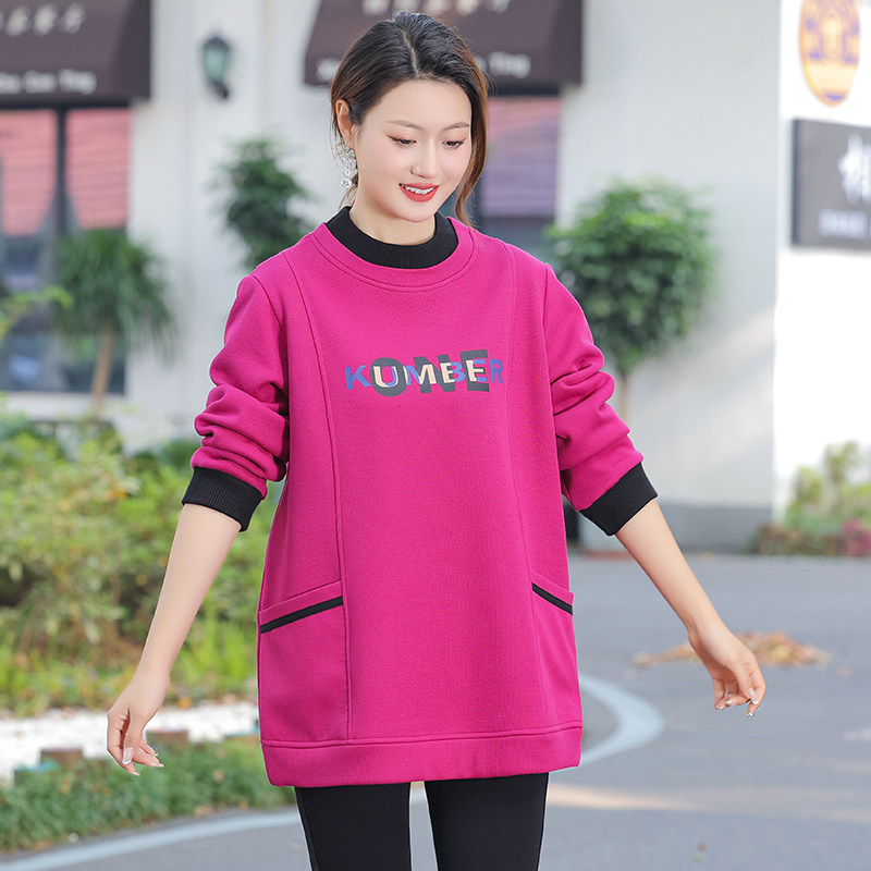 特大码休闲印花加绒加厚卫衣女2024冬新款半高领遮肚显瘦保暖上衣