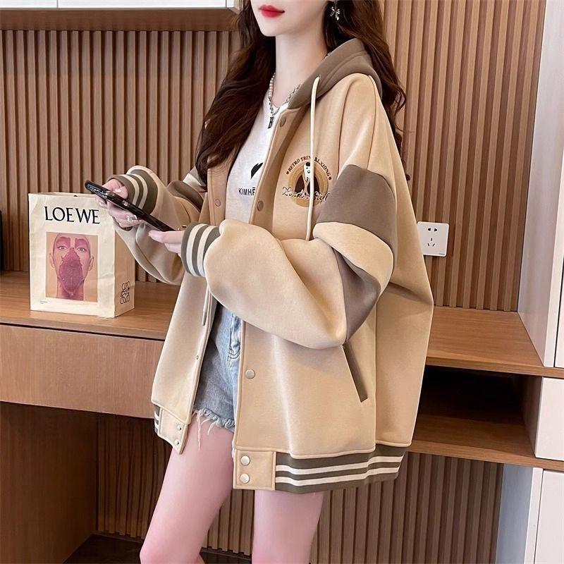 拼色刺绣连帽开衫卫衣女秋冬宽松大码棒球服初中高中学生显瘦外套