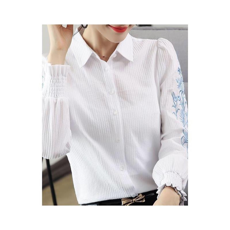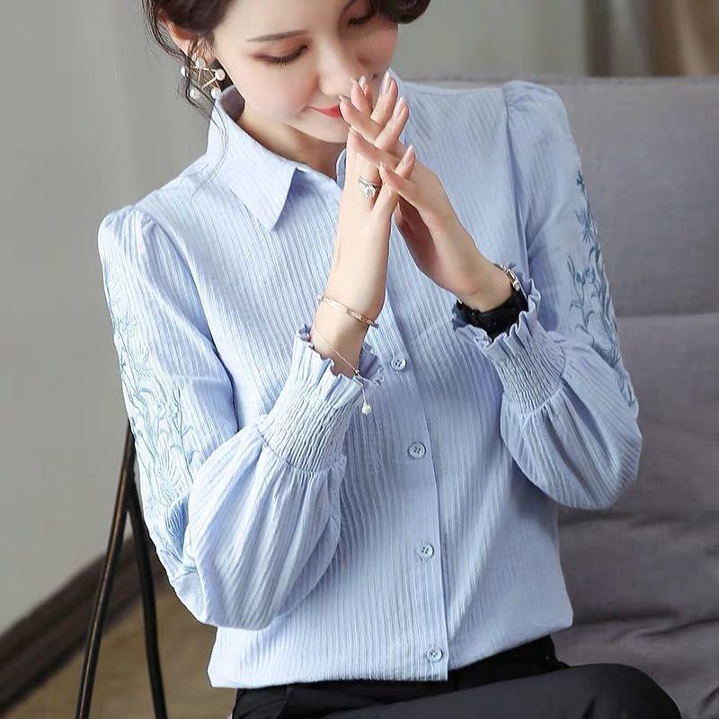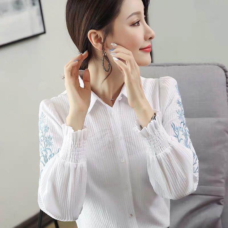 棉衬衣女春秋新款刺绣长袖气质显瘦衬衫灯笼袖上衣时尚百搭潮聚会