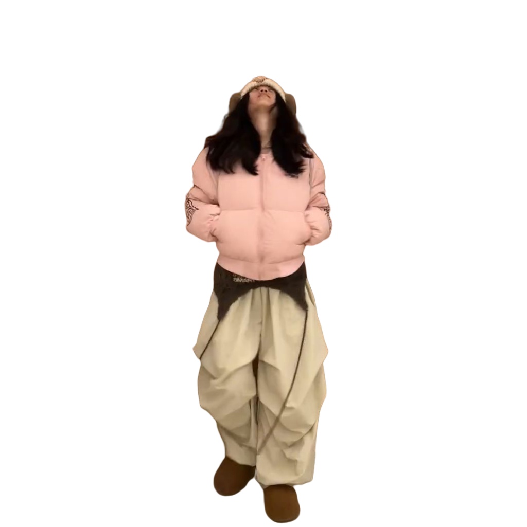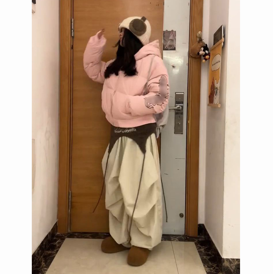 冬季慵懒风粉色拉链连帽设计感字母印花棉服小个子百搭面包服外套