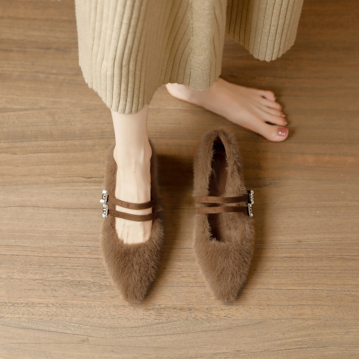 棕色尖头平底内增高5cm一字带毛毛单鞋女秋冬加绒甜美玛丽珍时尚