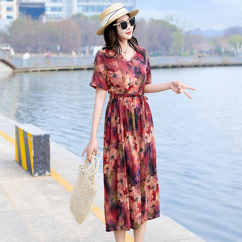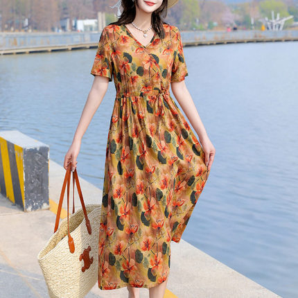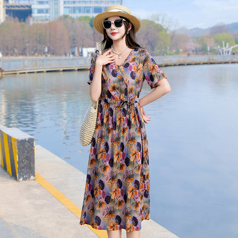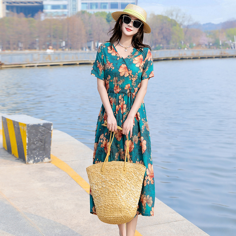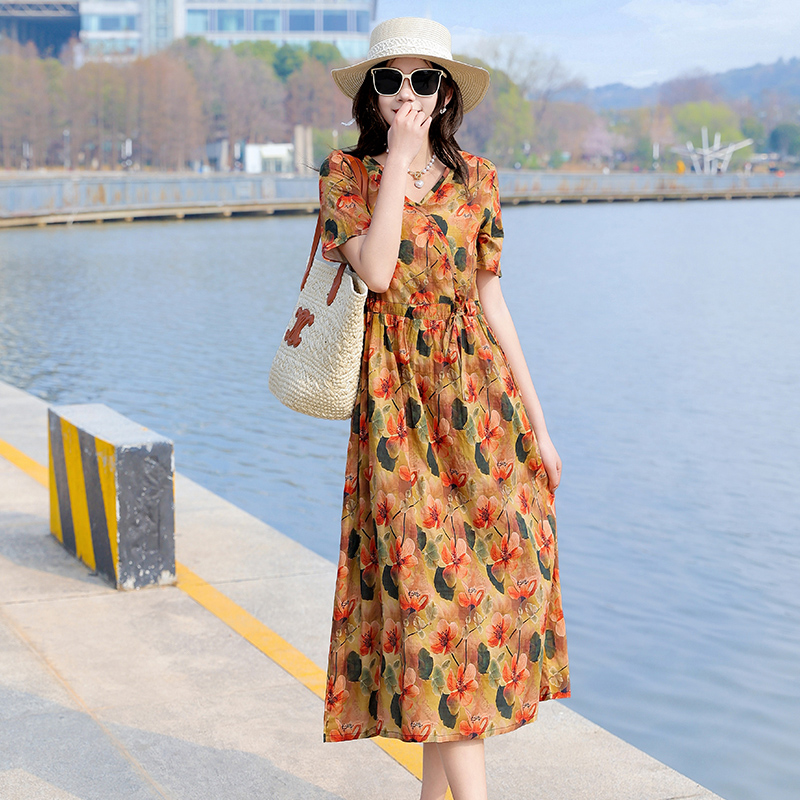 2025新款夏季大码棉麻连衣裙女高端亚麻宽松中长款度假风碎花裙子