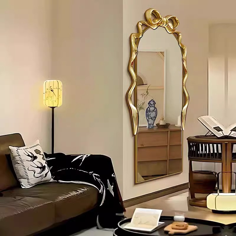 法式异形穿衣镜创意全身镜家用客厅ins试衣镜中古风蝴蝶结落地镜