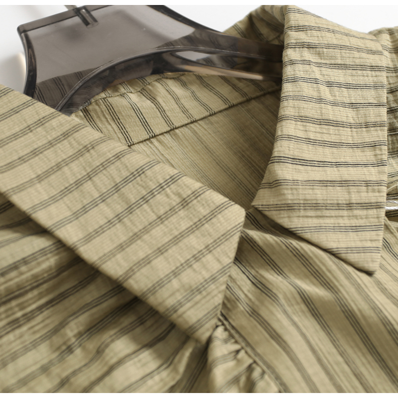 绿色条纹荷叶花边宽松显瘦翻领2024秋长袖减龄百搭休闲女衬衫F962