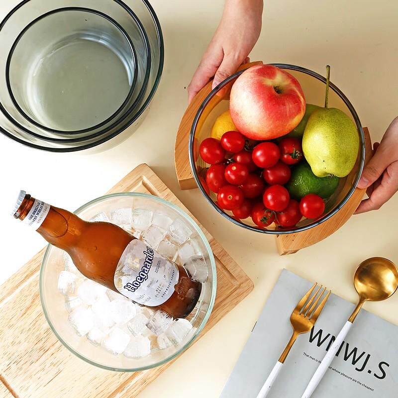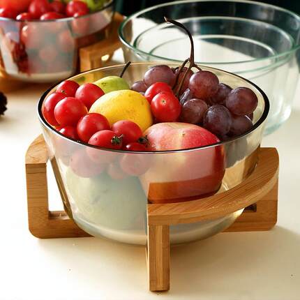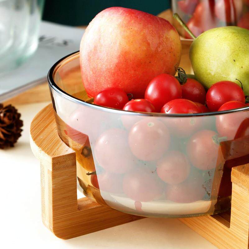 北欧轻奢玻璃碗高级带木架水果盘沙拉干 干果盘家用日式简约现代