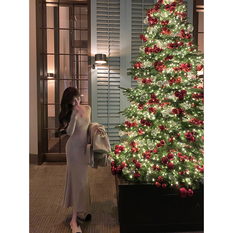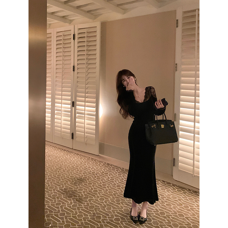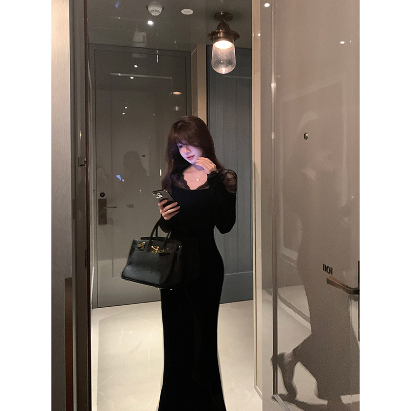 愉悦愉悦V领拼接蕾丝包臀长袖连衣裙女冬季性感气质修身显瘦长裙