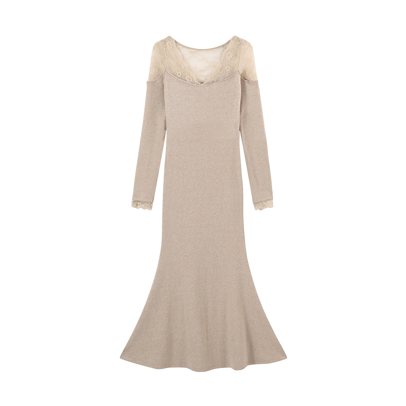 V领拼接蕾丝包臀长袖连衣裙女冬