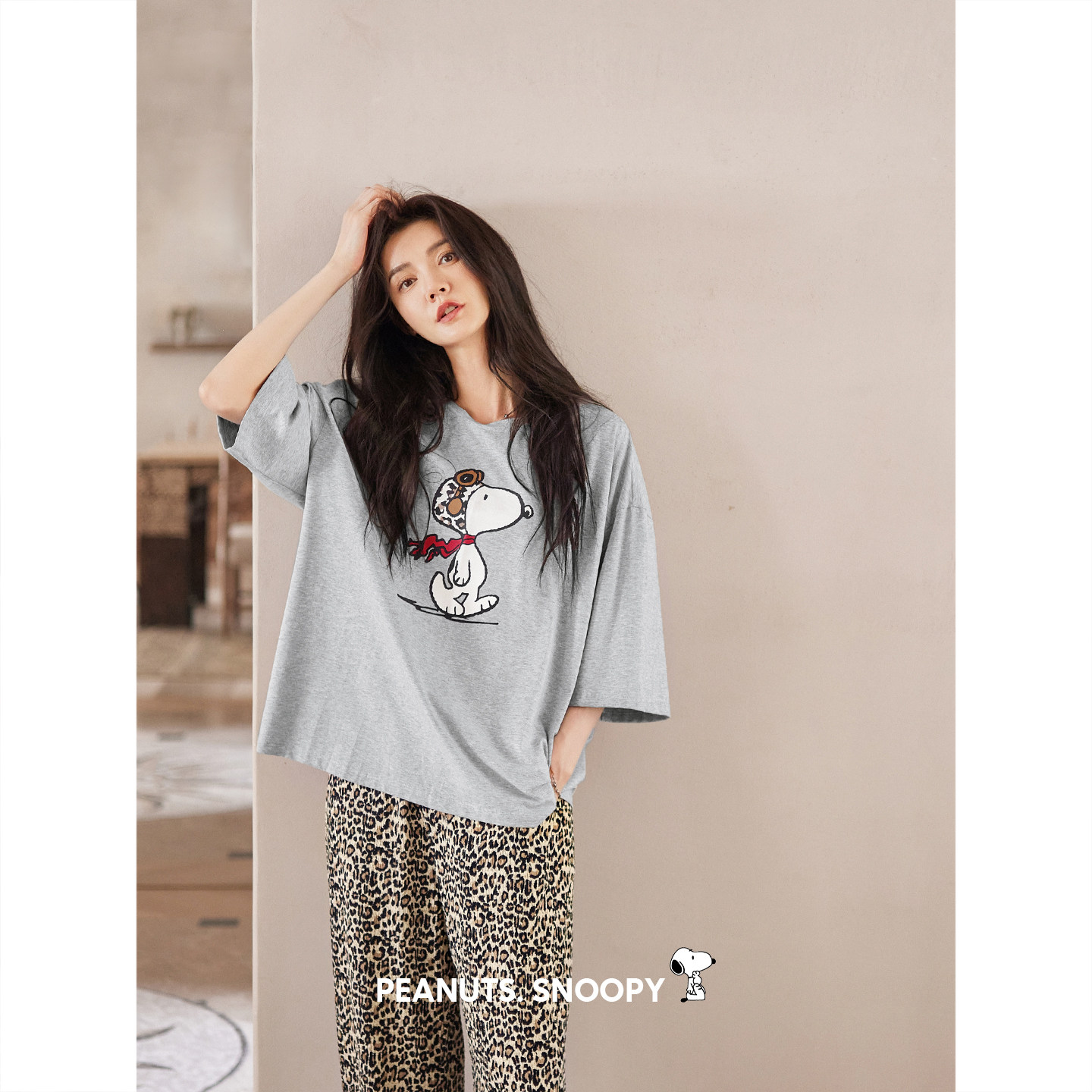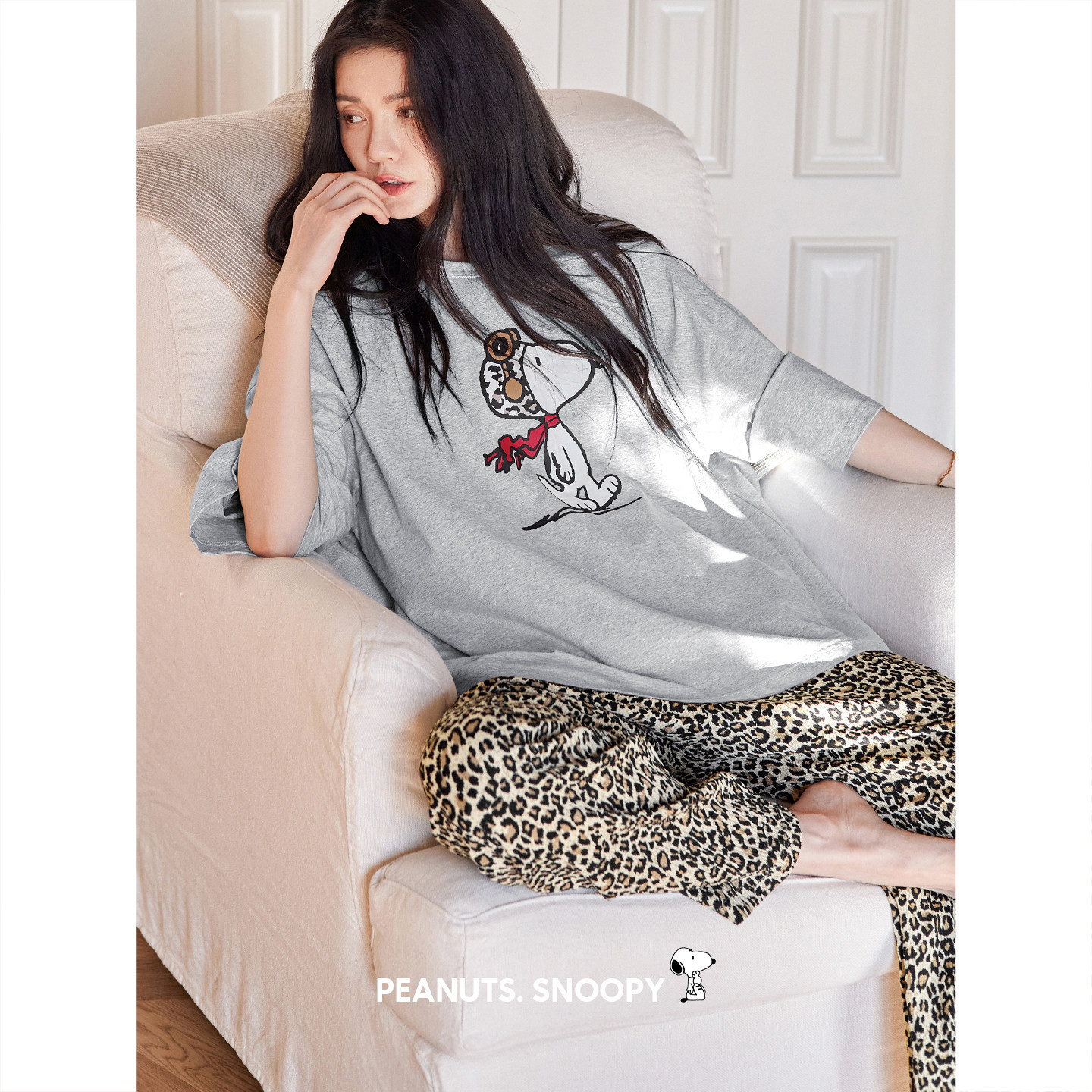 贝妍史努比睡衣女士夏季薄款短袖豹纹长裤套装慵懒宽松凉感家居服