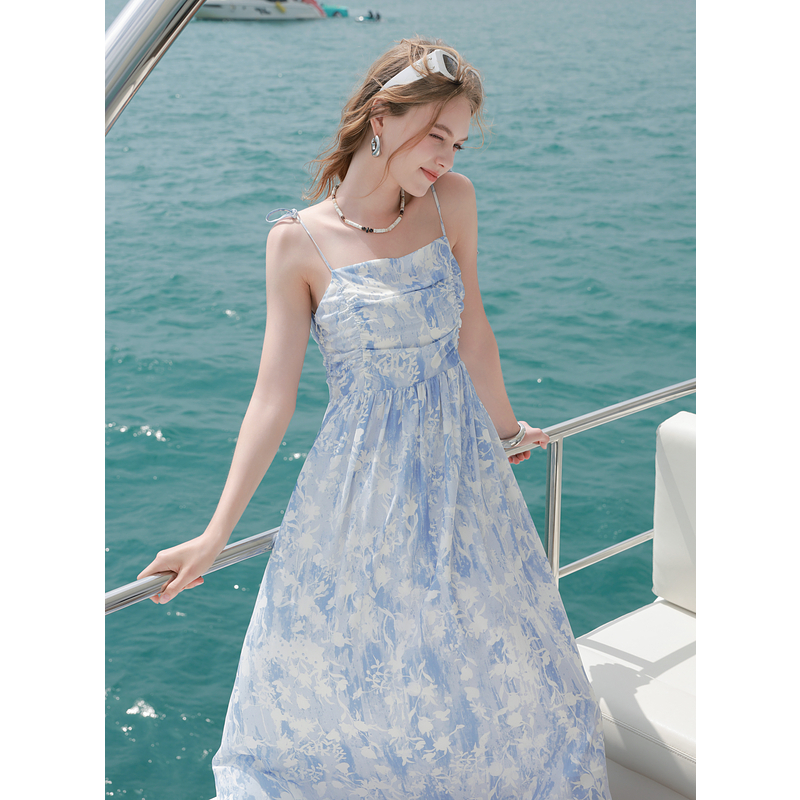 三彩2025夏季新款碎花吊带裙无袖高腰连衣裙显瘦A字裙长裙度假M