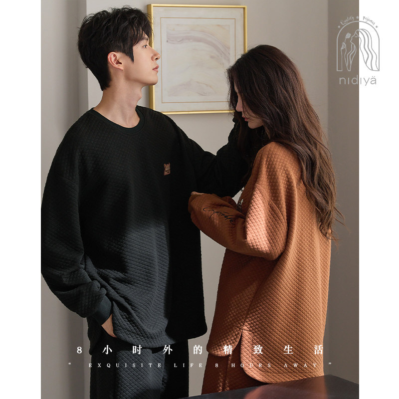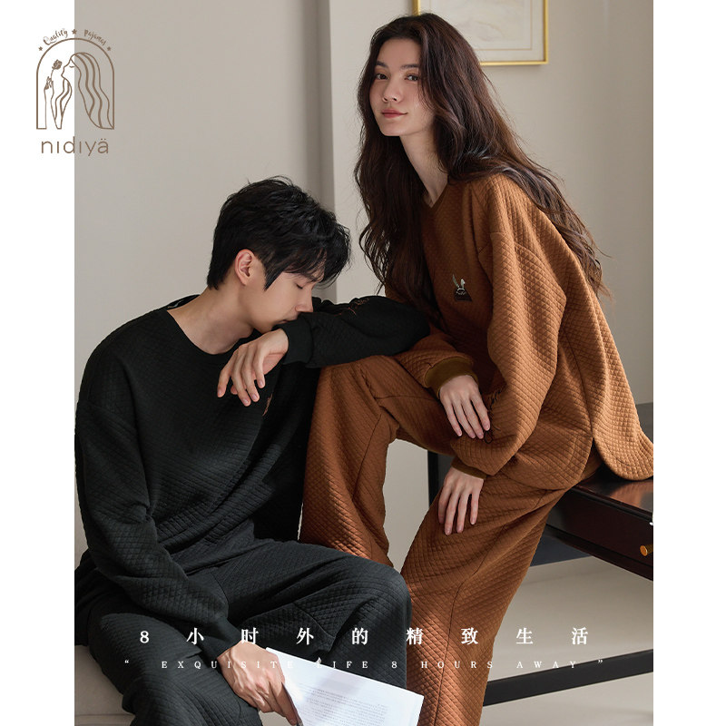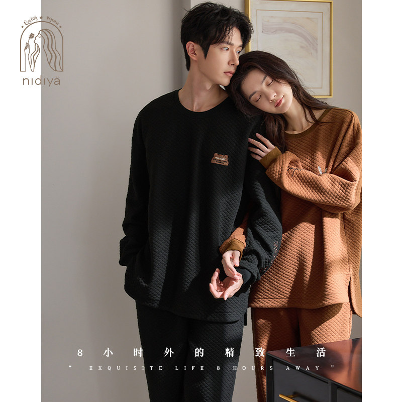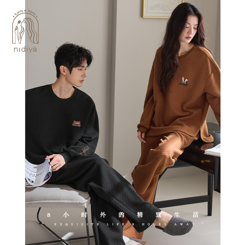 妮狄娅情侣睡衣女秋冬长袖纯棉加厚夹层男休闲外穿时尚家居服套装