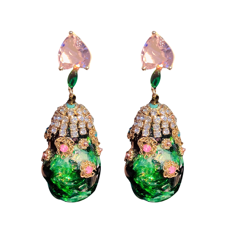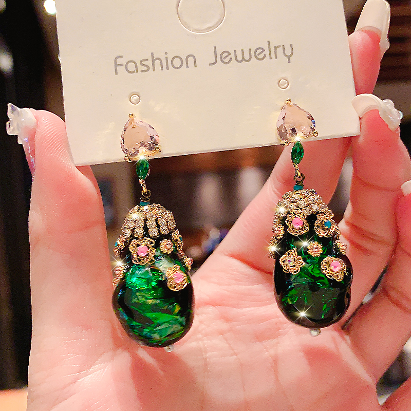高级感复古轻奢绿色水滴镶钻耳环女2025年新款潮钻石爱心耳钉耳饰