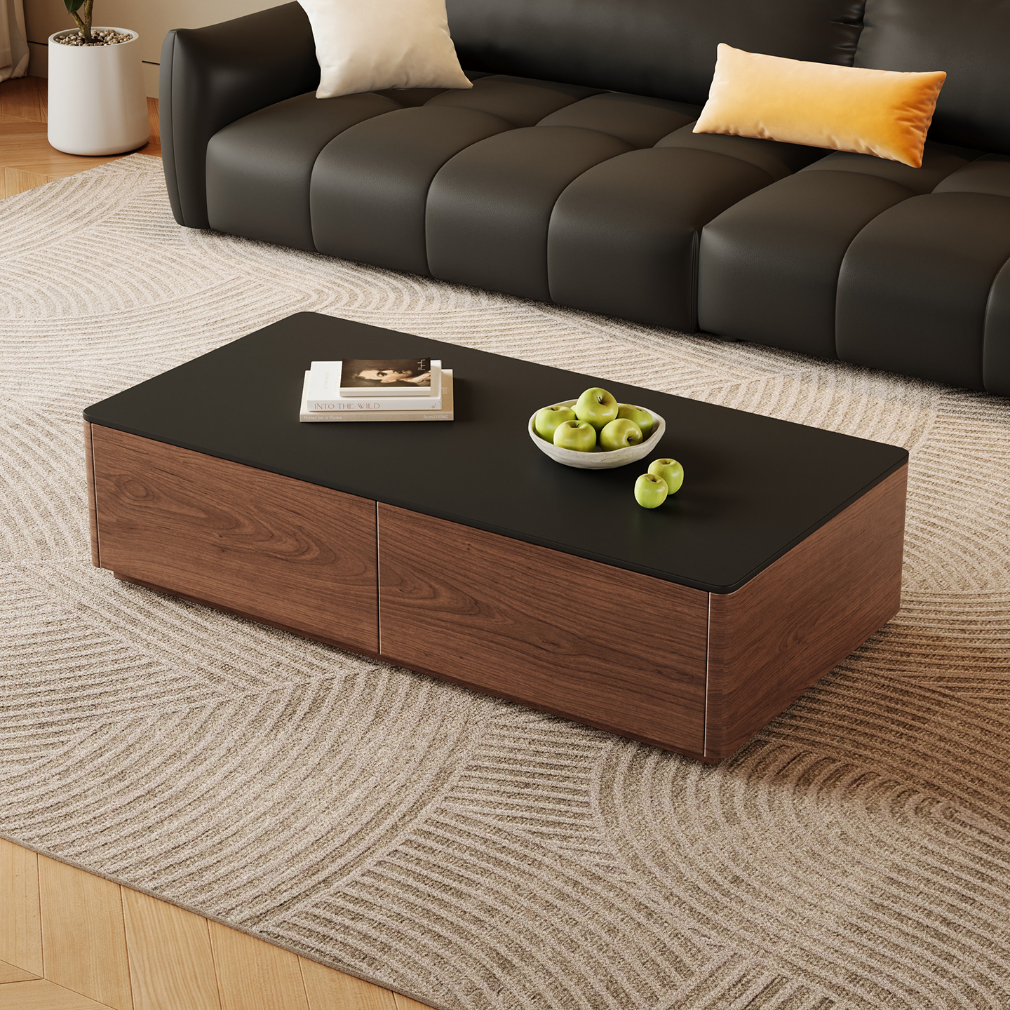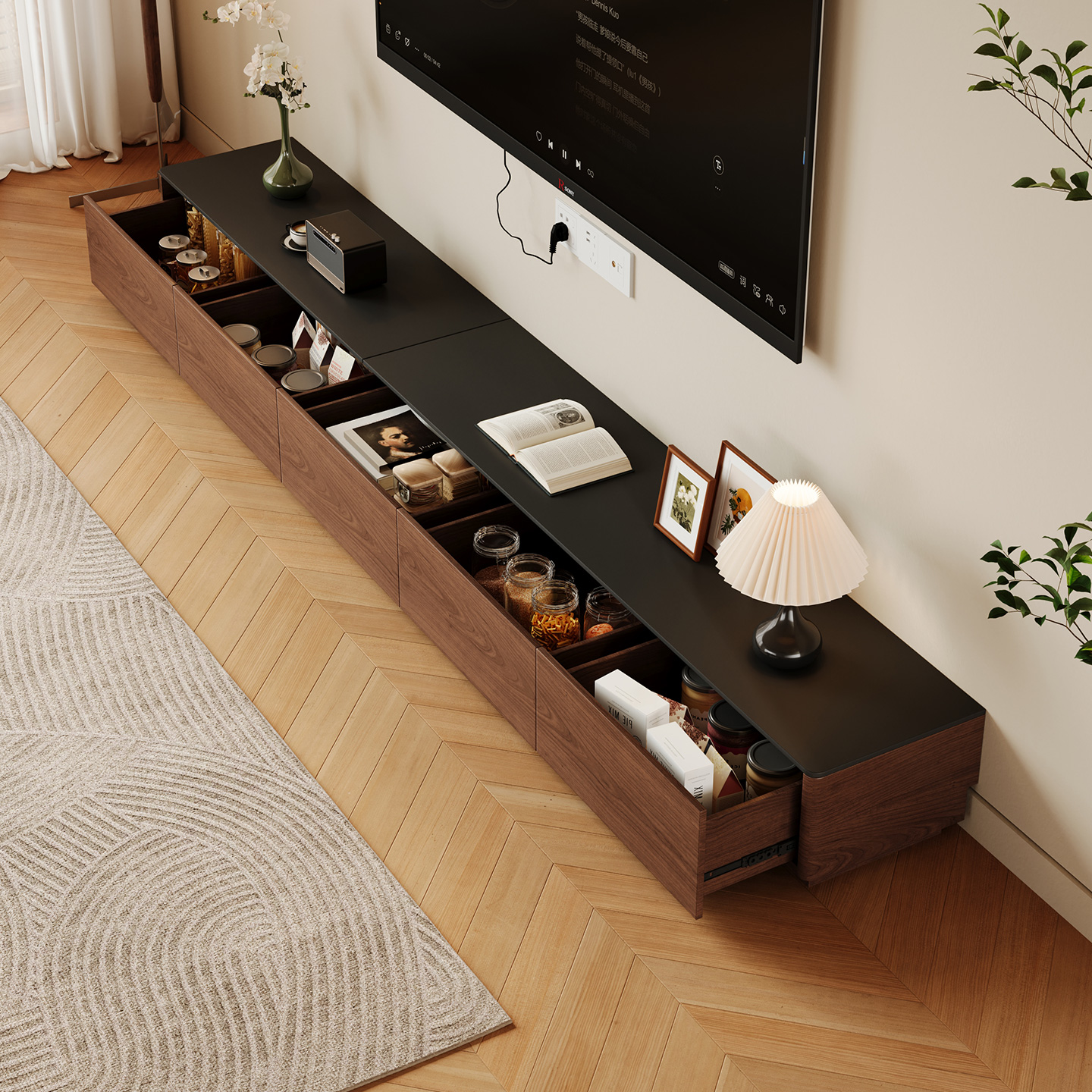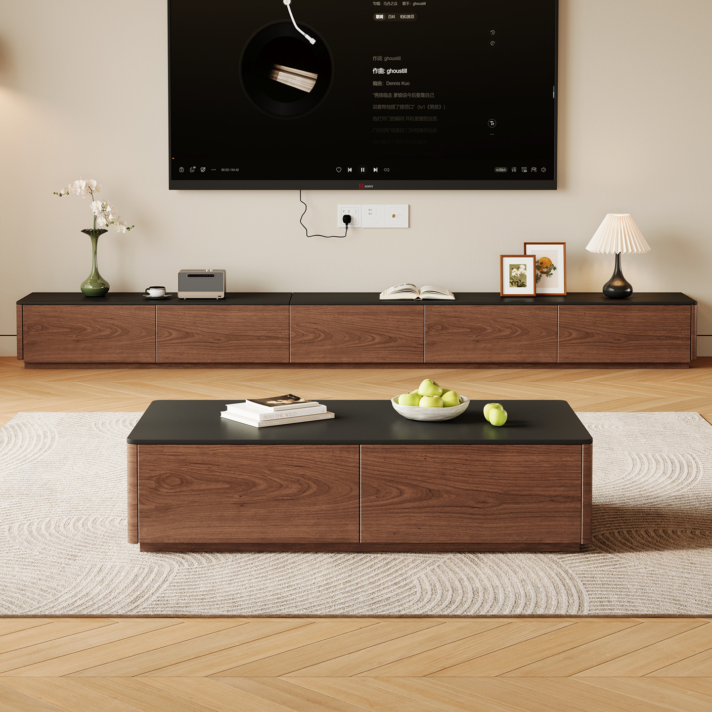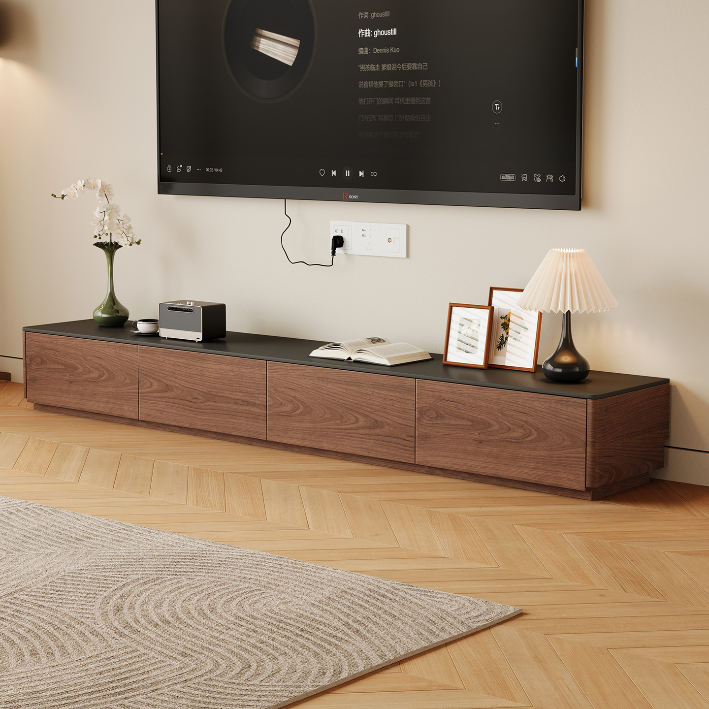 实木电视柜黑胡桃木电视机柜客厅2025新款落地柜中古岩板加长地柜