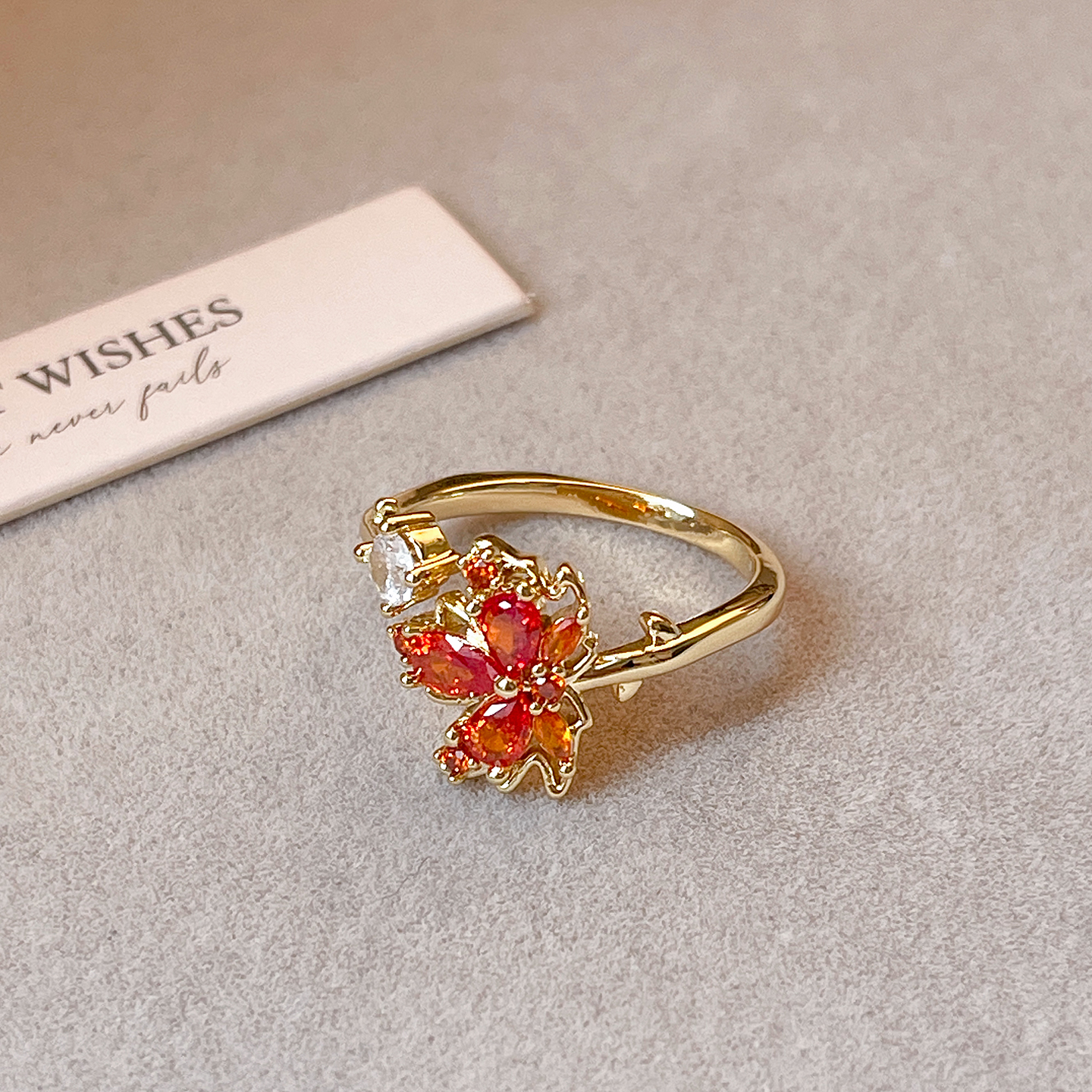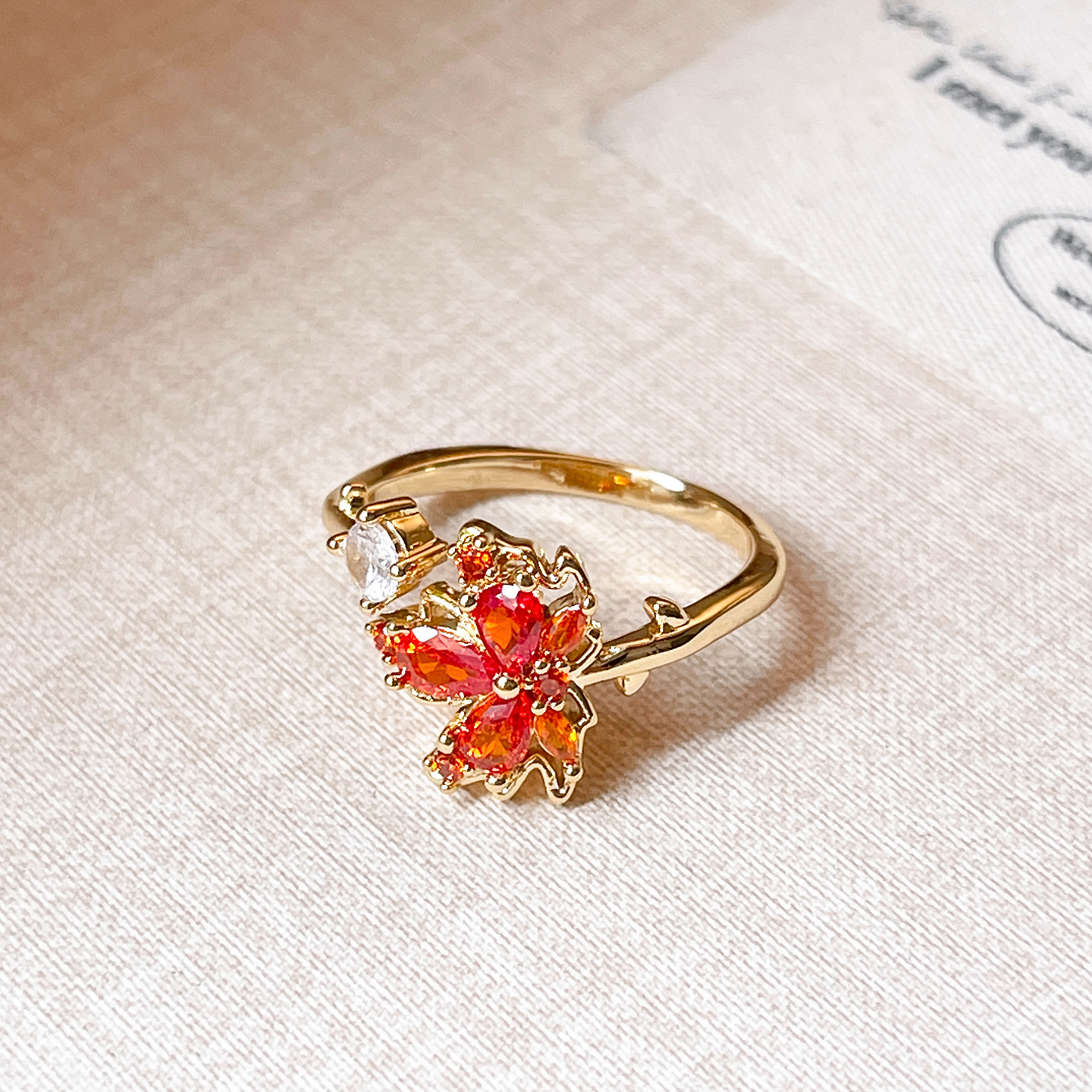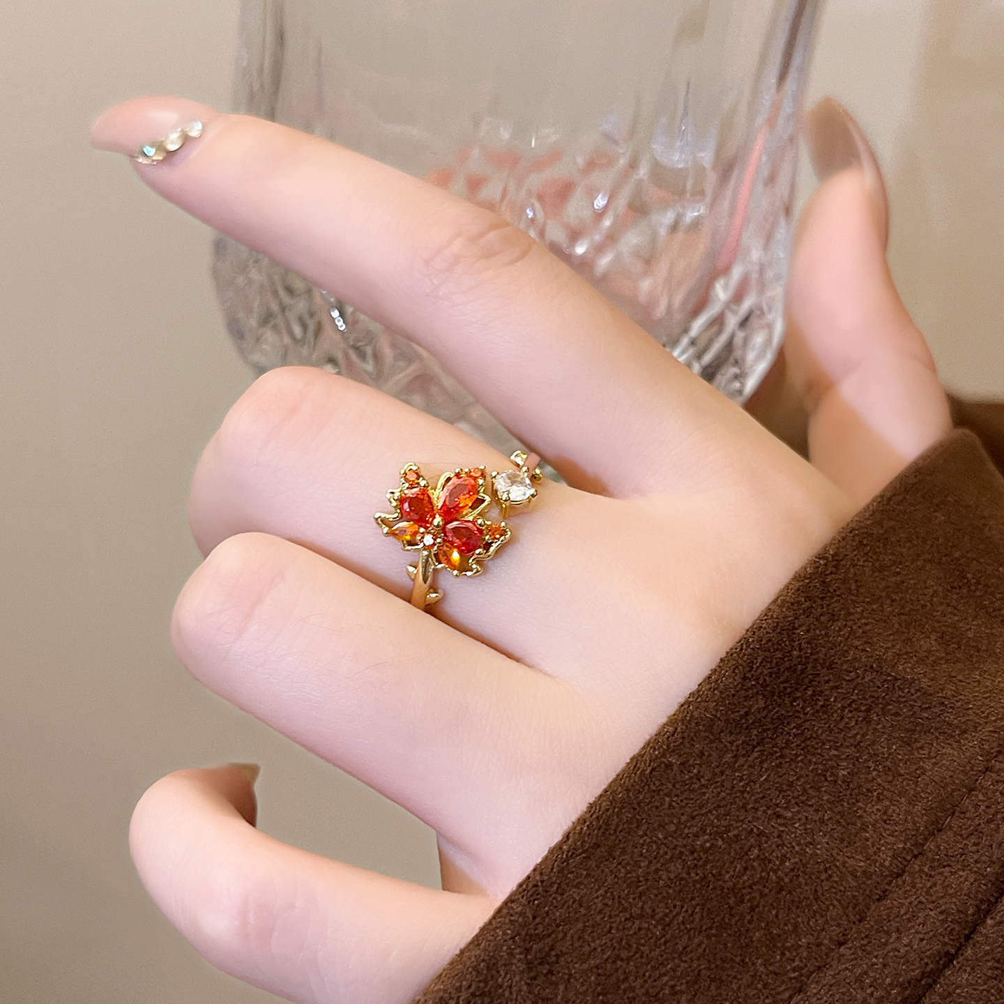 红色枫叶锆石开口戒指高级感指环