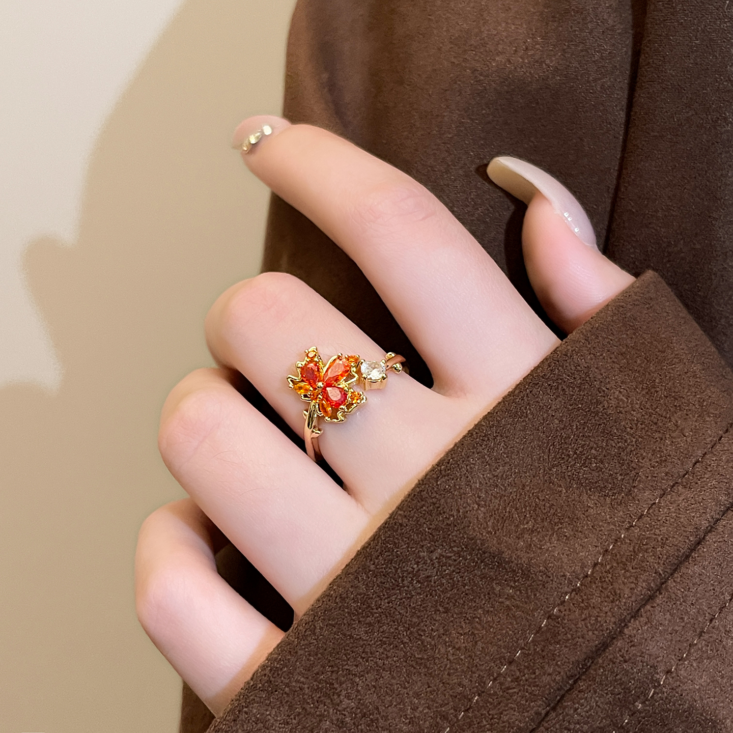 古里雅红色枫叶锆石开口戒指女2025新款爆款指环轻奢高级感食指戒