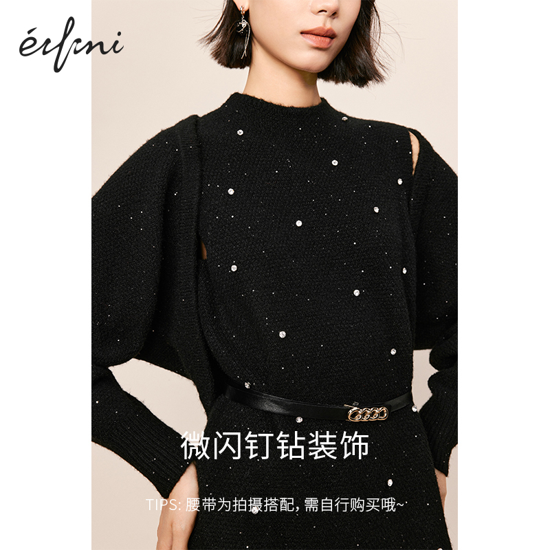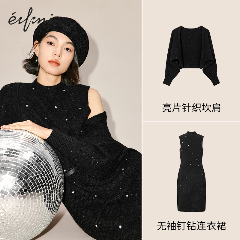 伊芙丽经典钉钻针织上衣连衣裙通勤盐系轻熟风套装2024秋装小黑裙
