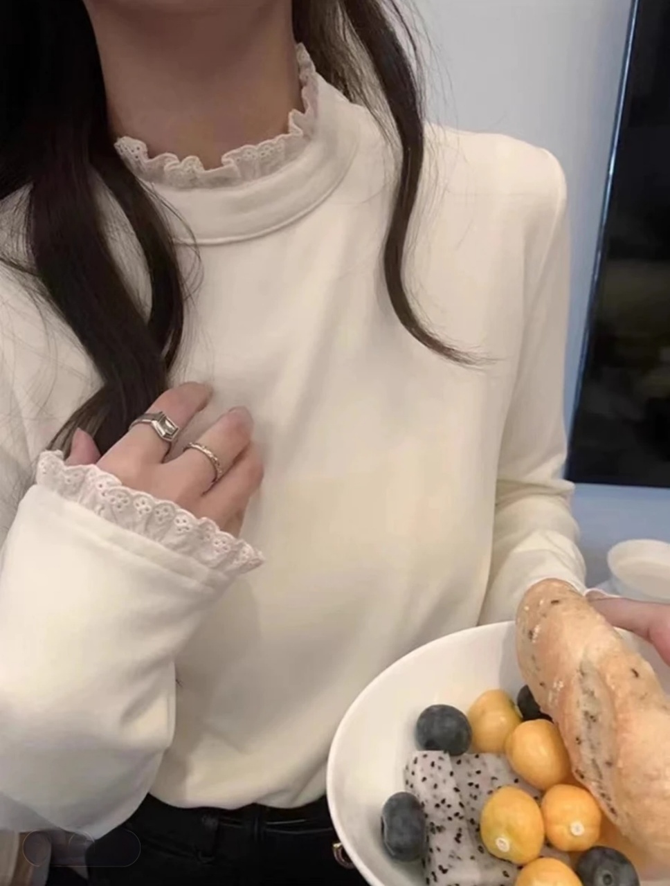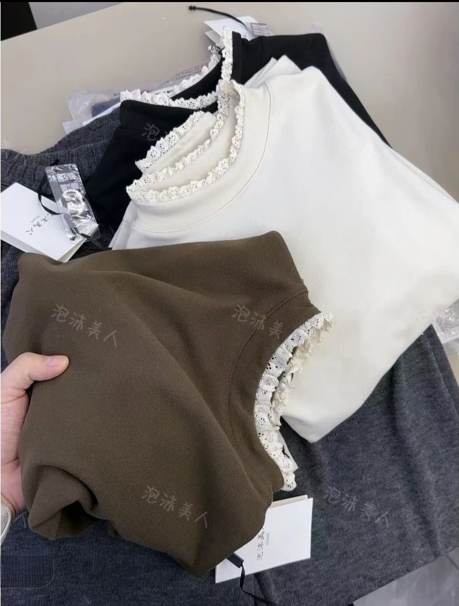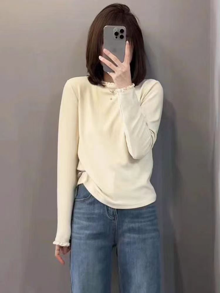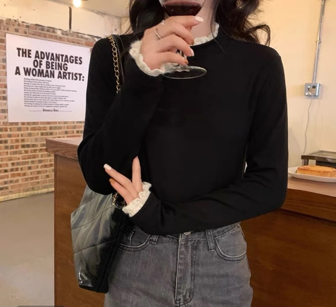 2025新百搭蕾丝花边半高领加厚版双面绒长袖打底衫女内搭上衣T恤