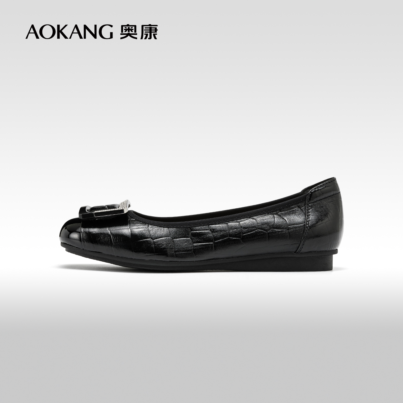 奥康女鞋 春秋款真皮方扣黑色简约浅口单鞋套脚办公室单鞋