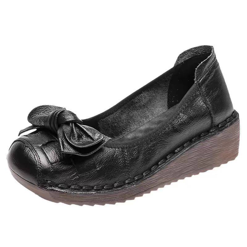 女士皮鞋中老年坡跟妈妈鞋蝴蝶结真皮复古民族风单鞋牛筋底不累脚