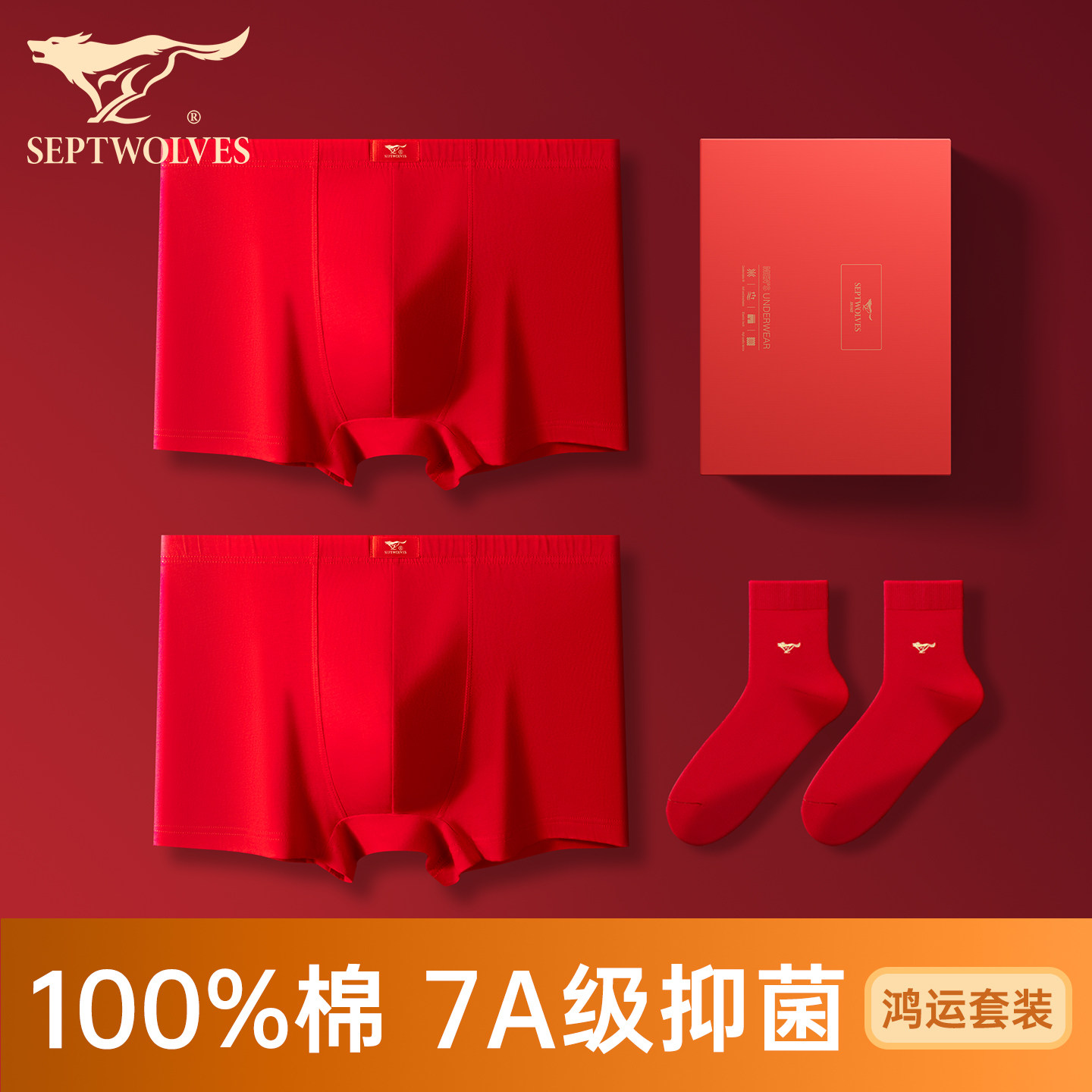 七匹狼内裤男士纯棉本命年大红色平角短裤衩男生宽松全棉四角裤头