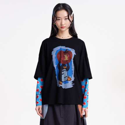 MOVEUP幻走2026春季新款.FUN系列假两件圆领纯棉印花短款T恤女