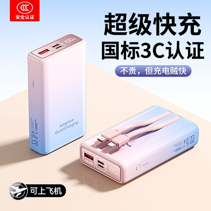 3c认证可上飞机充电宝2025新款大容量20000毫安官方旗舰店正品自带线超薄小巧便携超级快充适用苹果小米华为