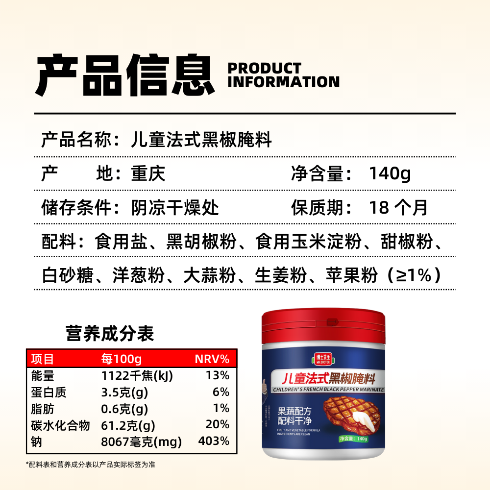 博士先生无添加法式黑椒牛排腌料 儿童牛肉腌制料 烧烤调料旗舰店