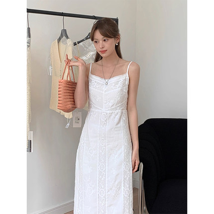 韩国chic夏季新款法式高级感蕾丝钩花收腰显瘦长款吊带连衣裙女