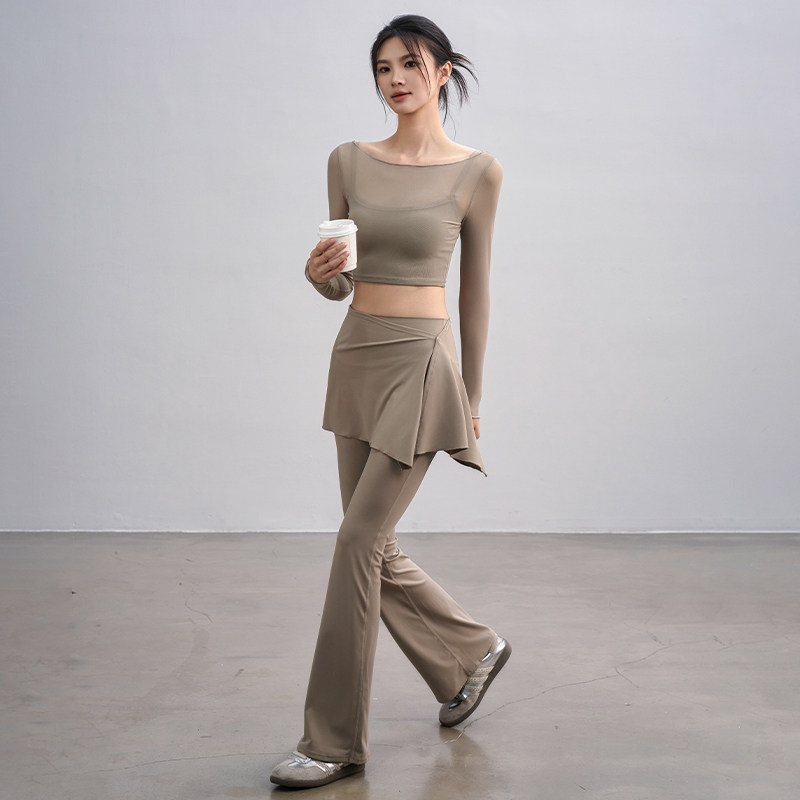瑜伽服套装女秋季带胸垫运动上衣假两件网纱长袖普拉提训练健身服