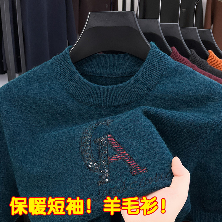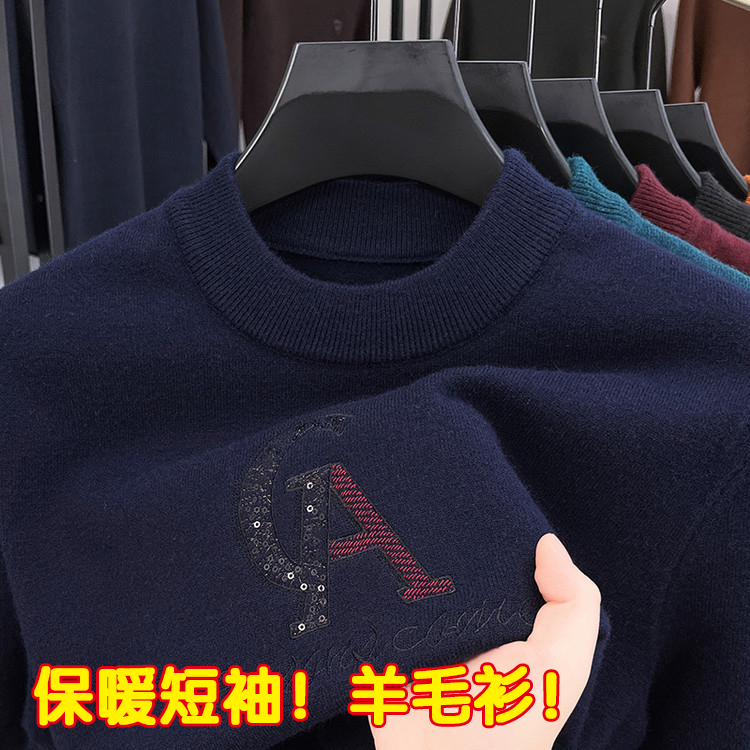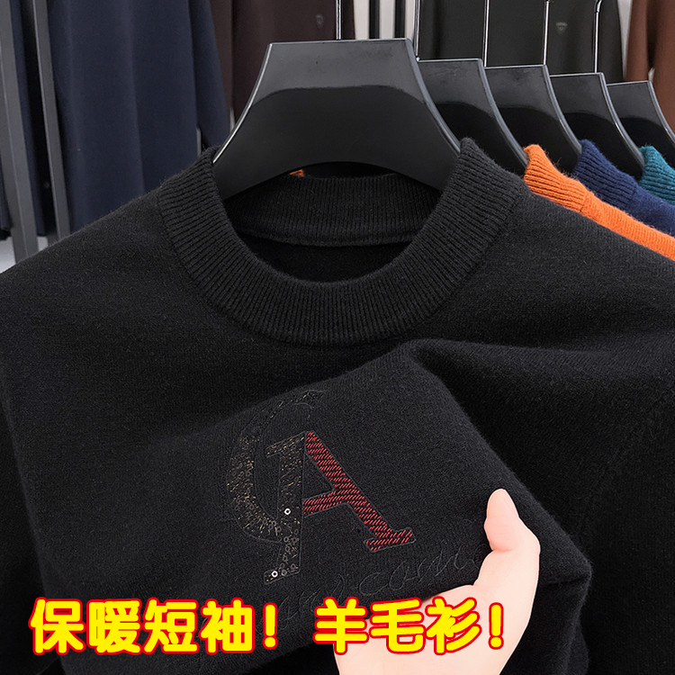 春秋季短袖羊毛衫男中青年半高领毛衣半袖刺绣保暖针织衫厚款T恤
