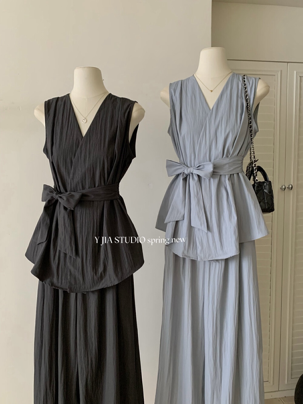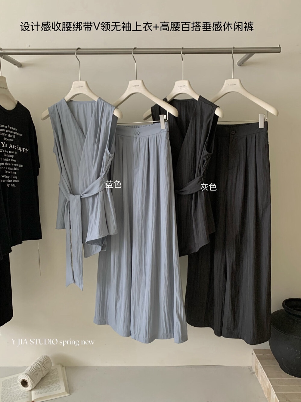 Y.JIA 伊嘉韩版气质收腰绑带V领上衣+高腰百搭垂坠感休闲裤套装女