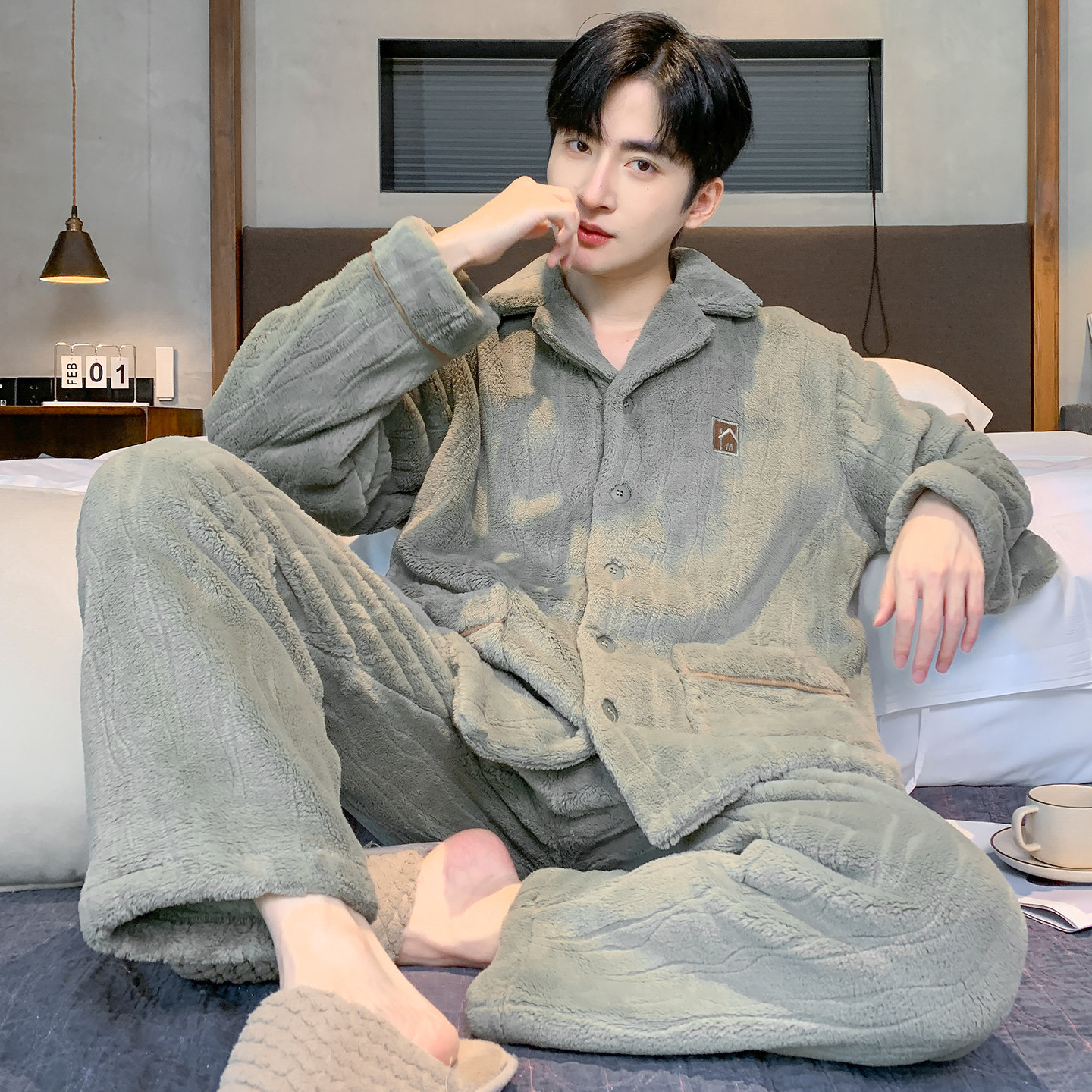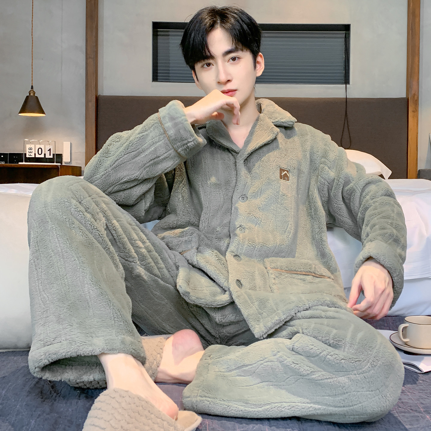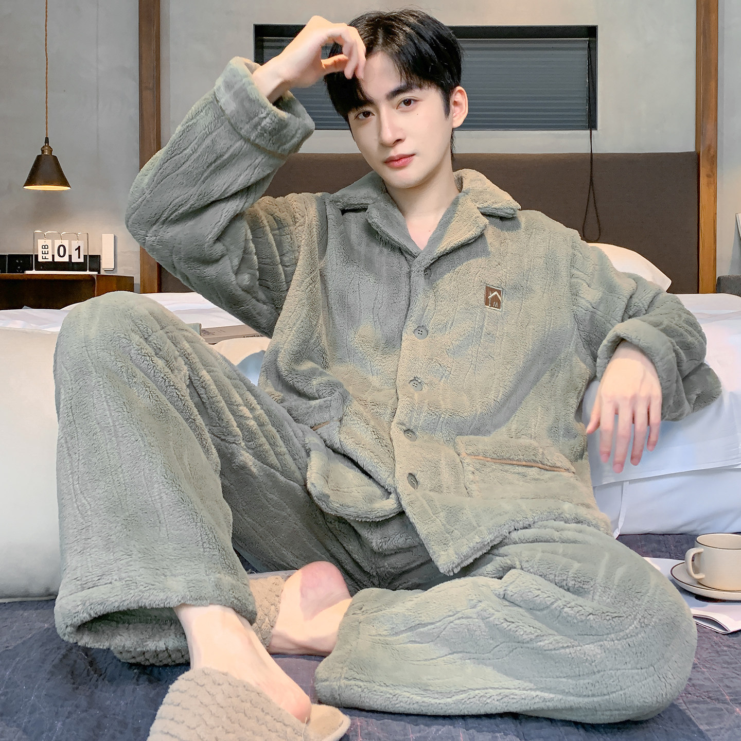 芬腾可安睡衣男款男士冬季珊瑚绒加绒加厚法兰绒军绿家居服秋冬款
